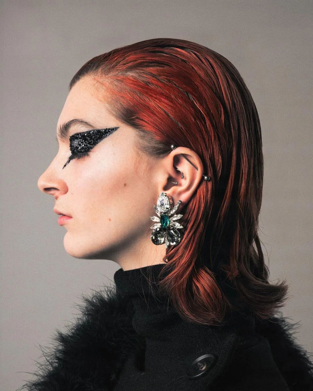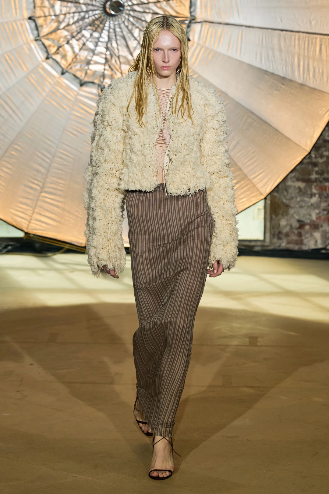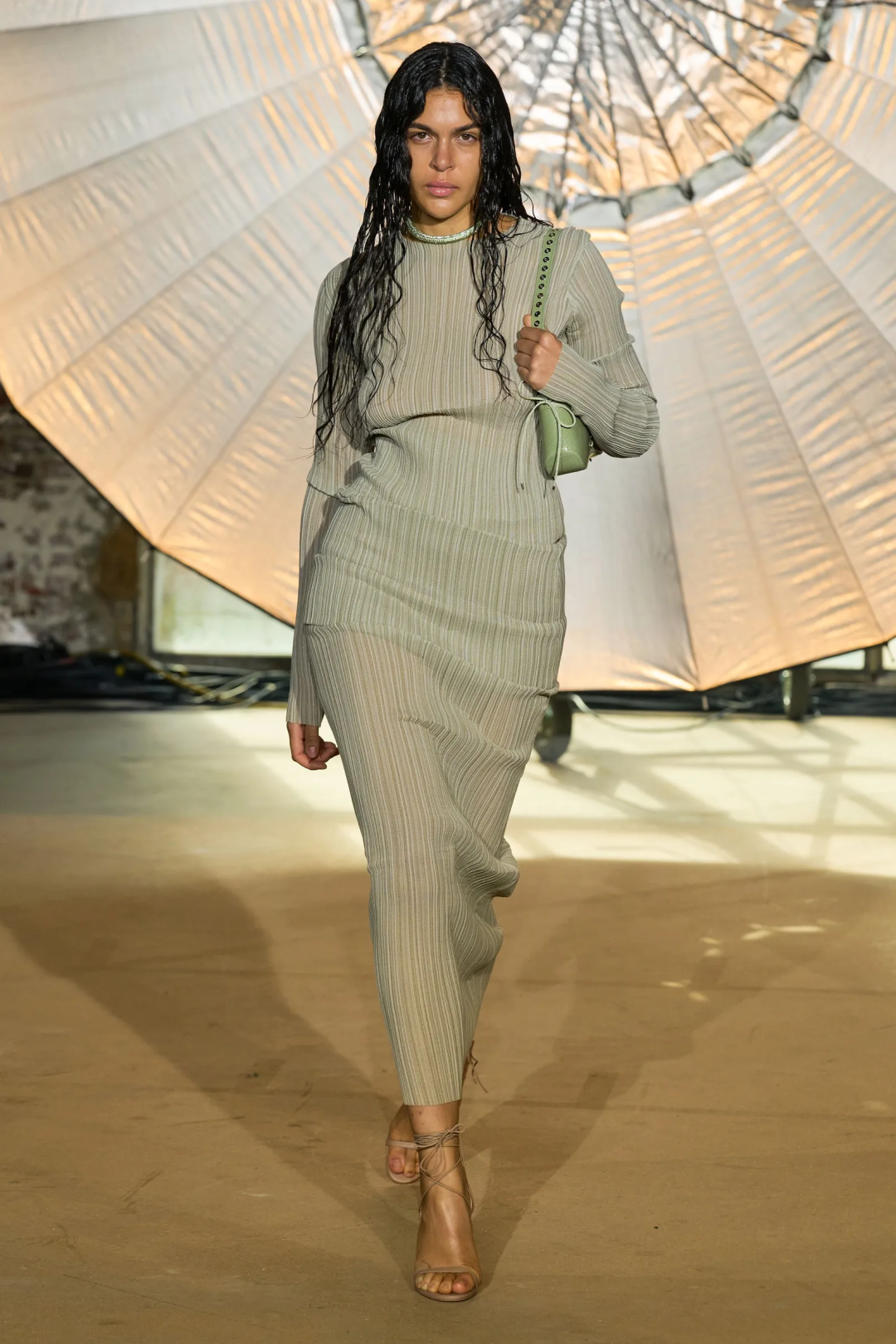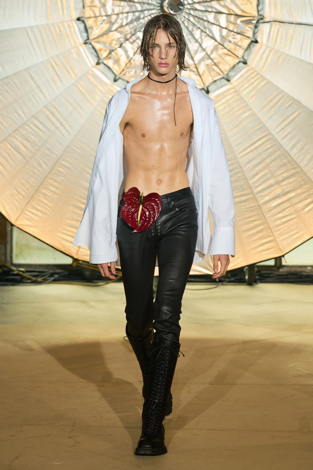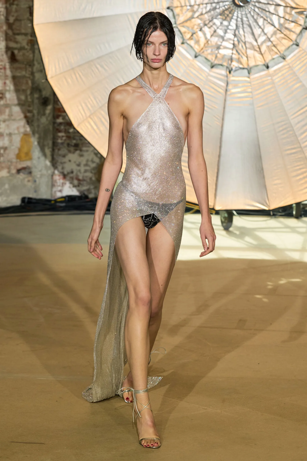 2023春夏系列参考了千禧明星穿搭,将Y2K更加性感、裸露化。模特们打湿的造型配上闪闪发光的衣服,透露着一股本身与神秘。