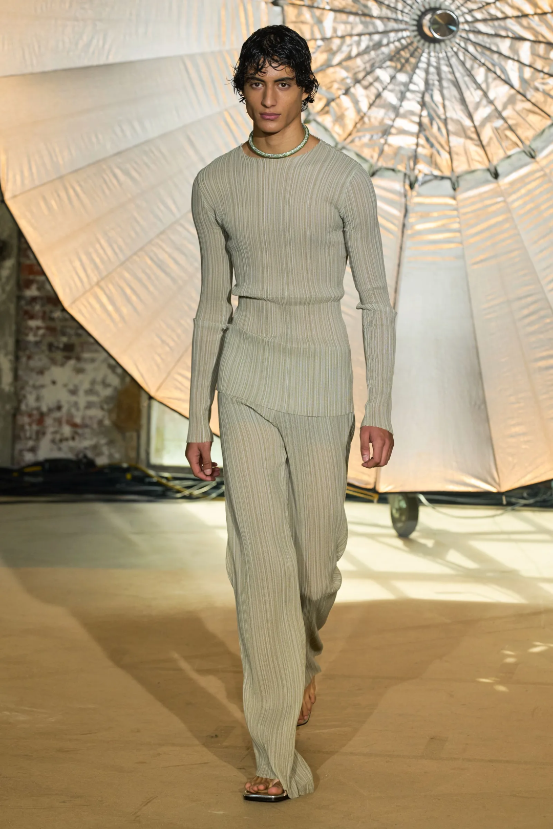具有休闲感觉的外衣和裤子采用了De Saint Sernin认为与已故三宅一生著名的褶皱相类似的plissé材料。