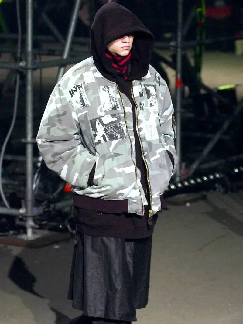 在当时时装界以纤细瘦长的修身造型为主导风格的大环境下,Raf Simons横空出世。用当时并不「时尚」的Bomber Jacket,和帽衫、条纹高领衫、裤子等Oversized的单品,颠覆了传统男装剪裁与男性时尚。