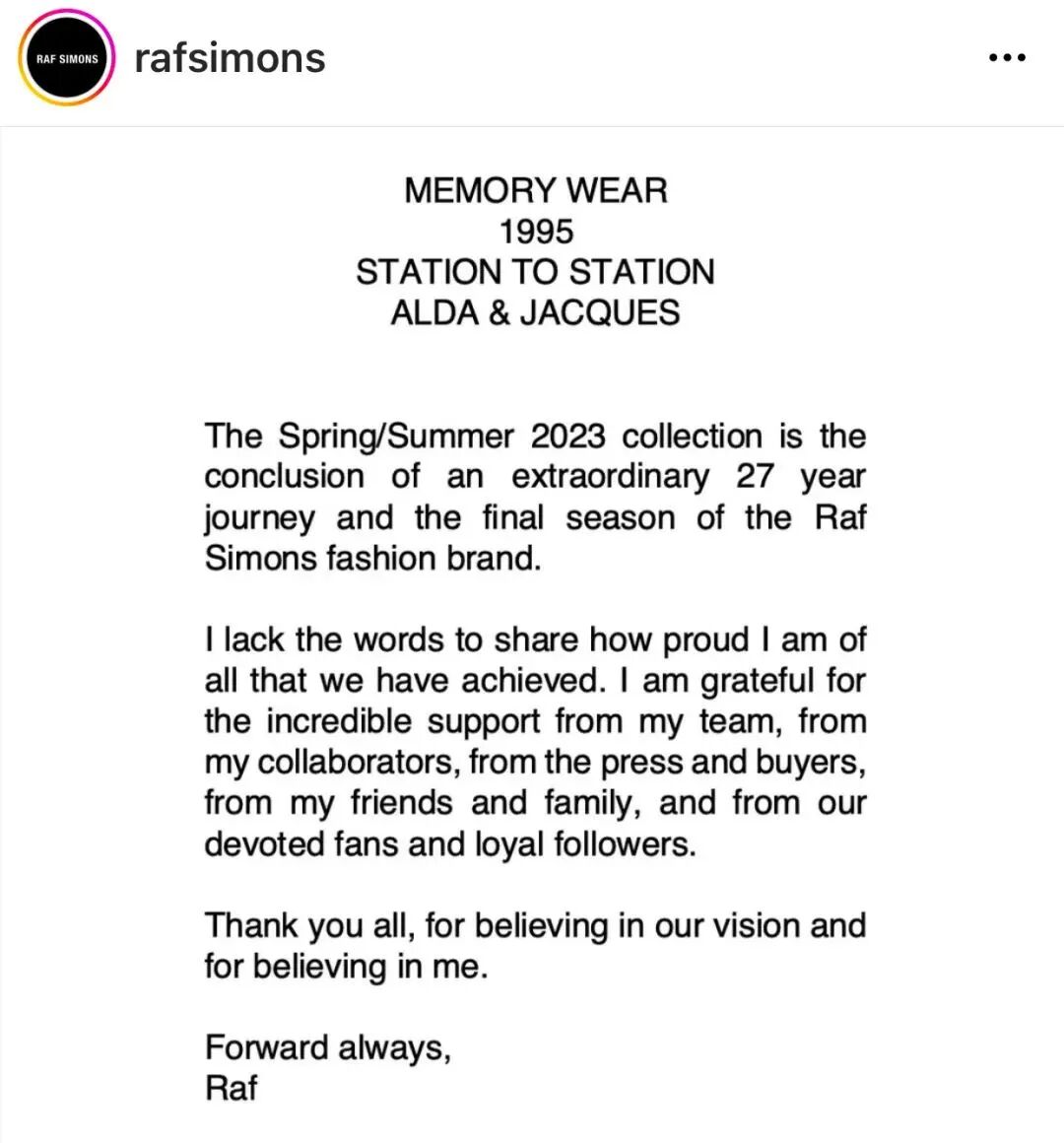 「2023春夏系列将是品牌27年非凡旅程的结束,也是Raf Simons品牌的最后一季。我缺乏语言来形容做到的这一切让我感到多么自豪。感谢来自我的团队、合作者、媒体、买手们,以及我的朋友、家人以及忠实粉丝和追随者们的支持。感谢你们所有人,相信我们的信念以及对我的信任。」