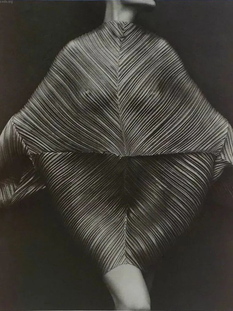 三宅一生推翻了西方那种「由外向内」的设计传统——把面料铺在人体模型上,通过裁剪、缝制和褶皱等方式雕塑出理想的女性线条。