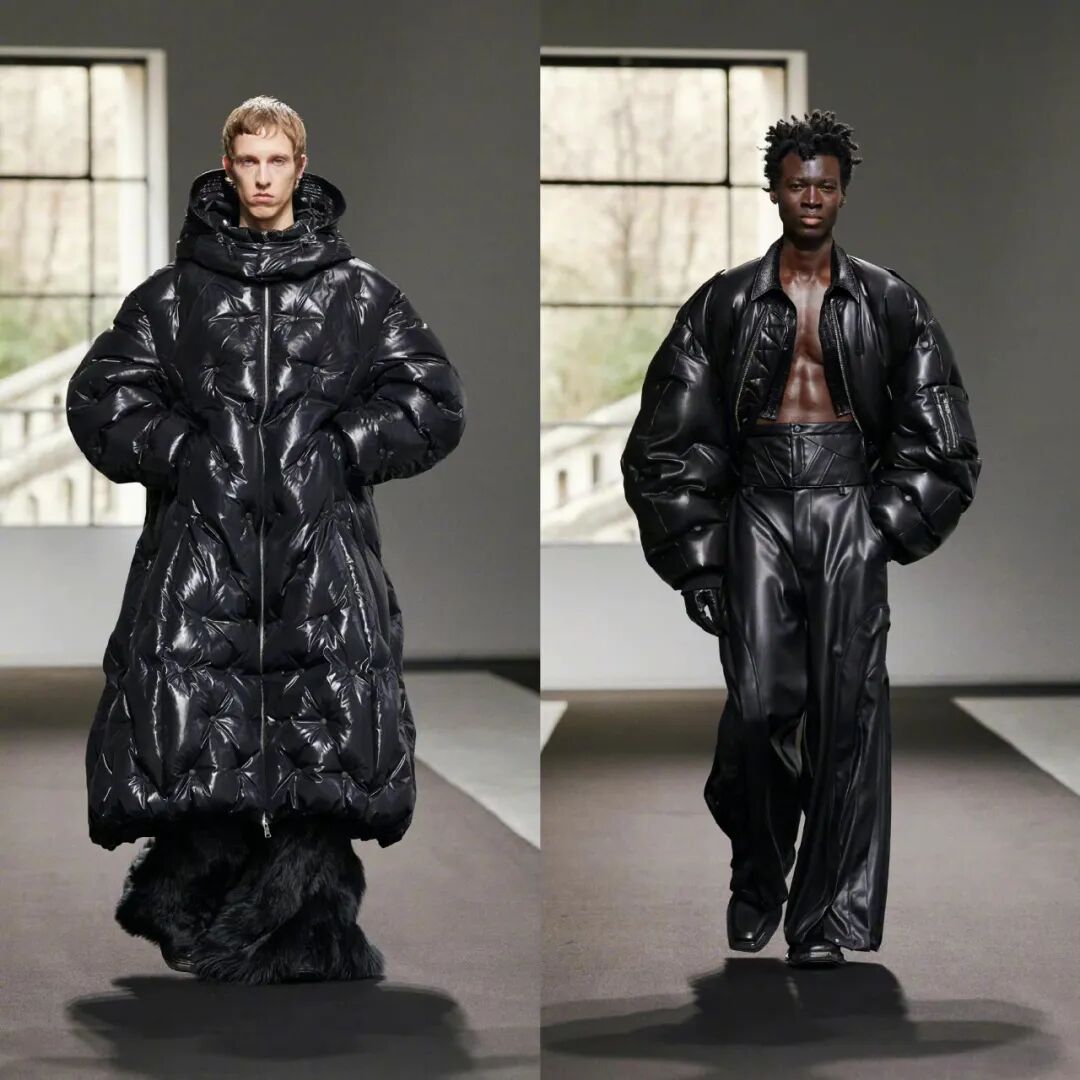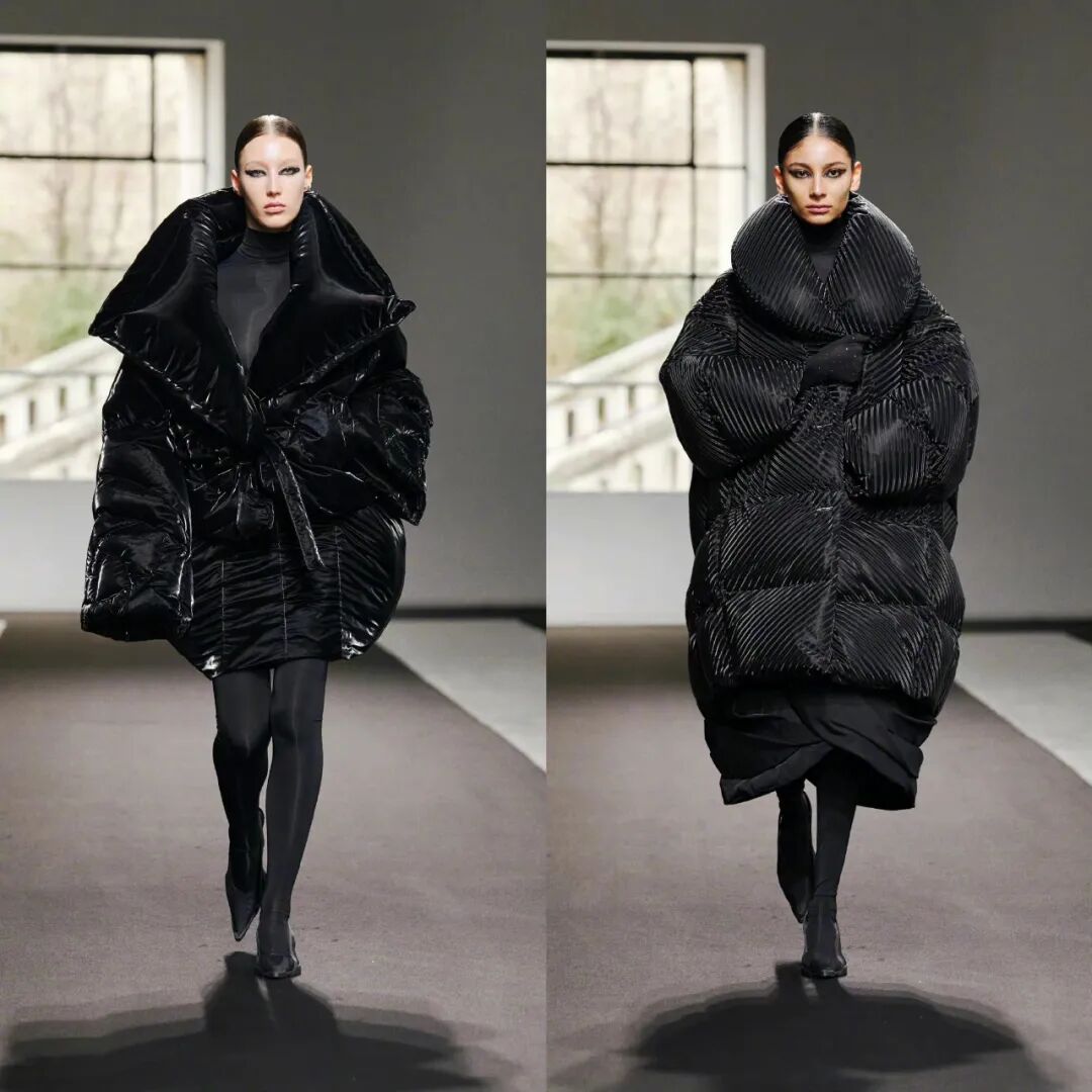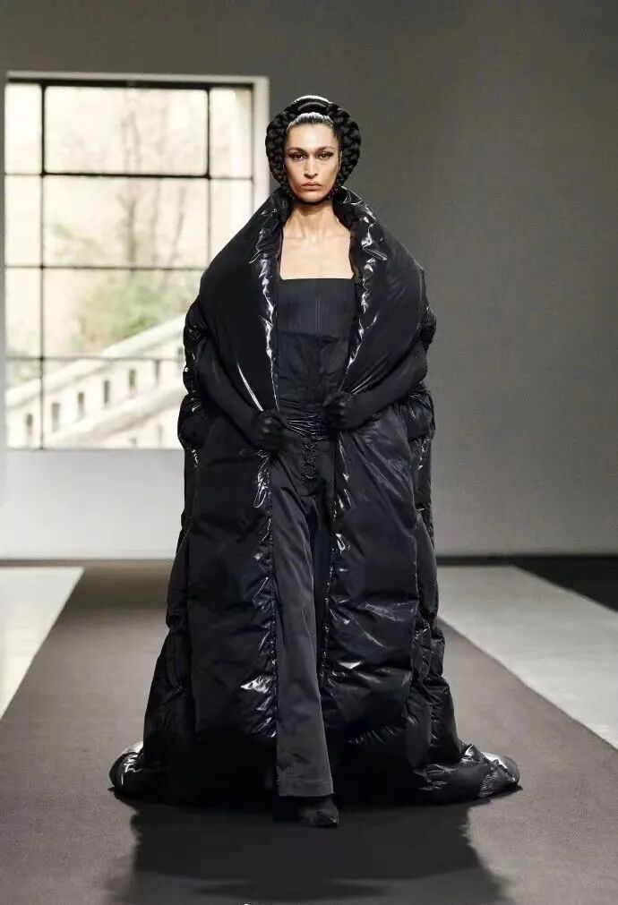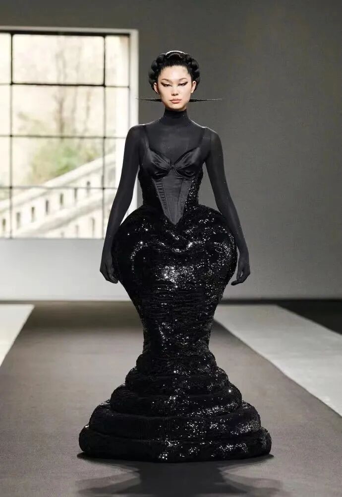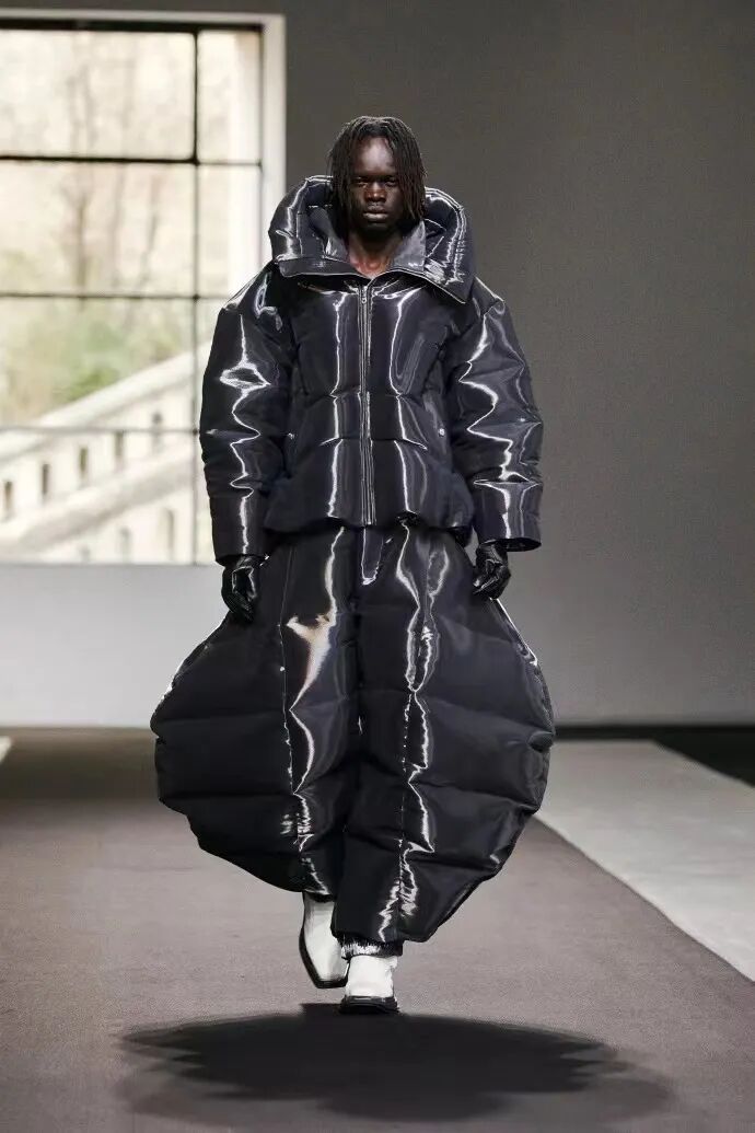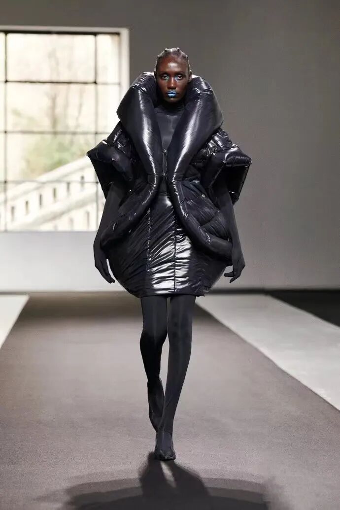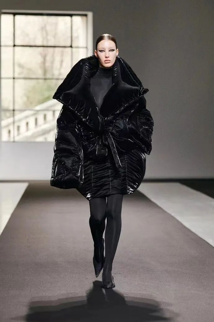 全新的CHENPENG羽绒礼服系列,全系列黑色为主色调的时装系列中,选用人造水晶、仿生鳄鱼皮革、丝绒提花、回收尼龙等可持续材料,以环保的方式增加时装视觉立体度与高级定制奢华感,传统防寒的羽绒服被赋予了新的场景可能。
