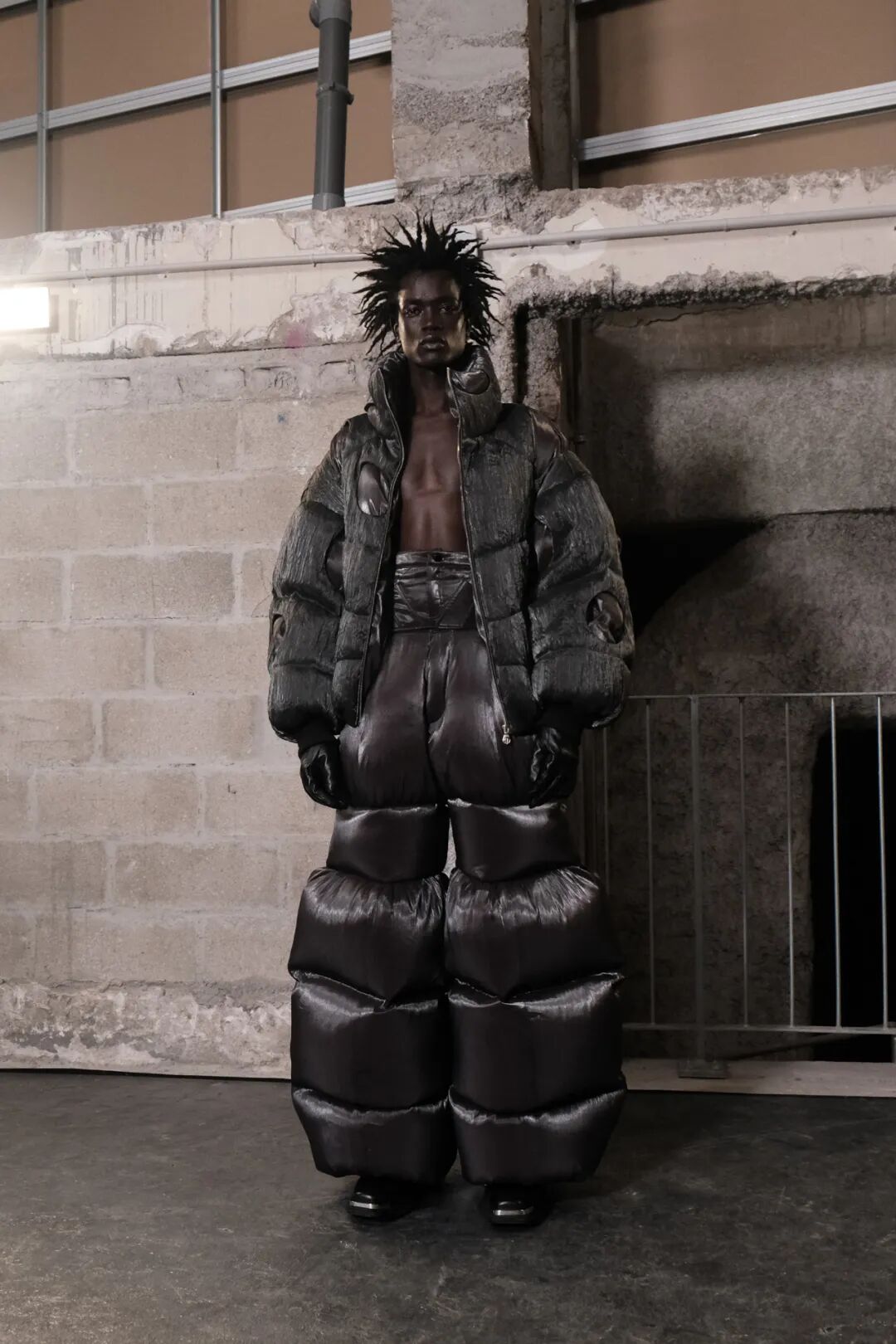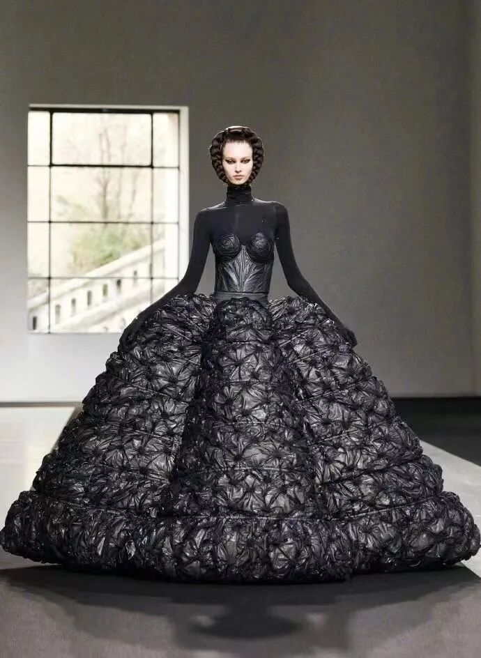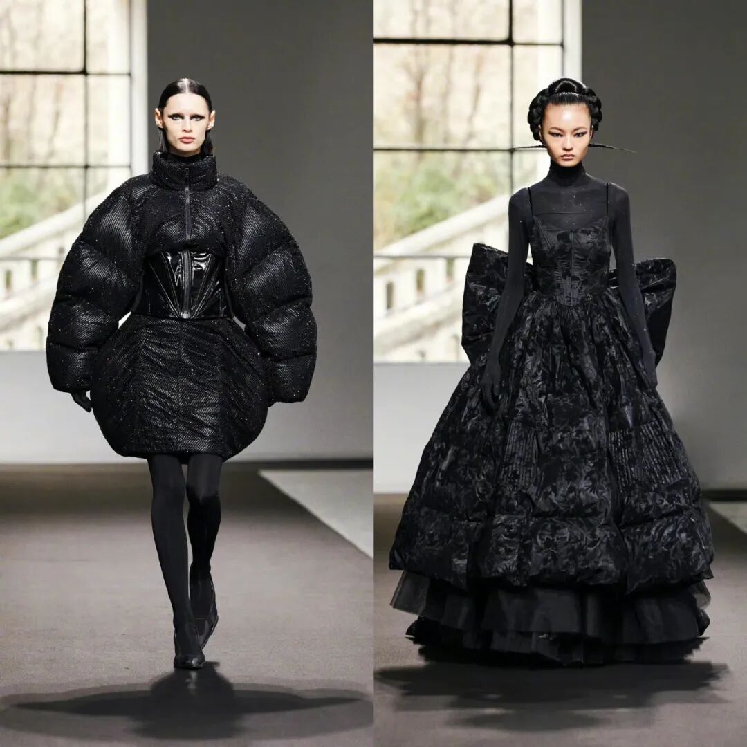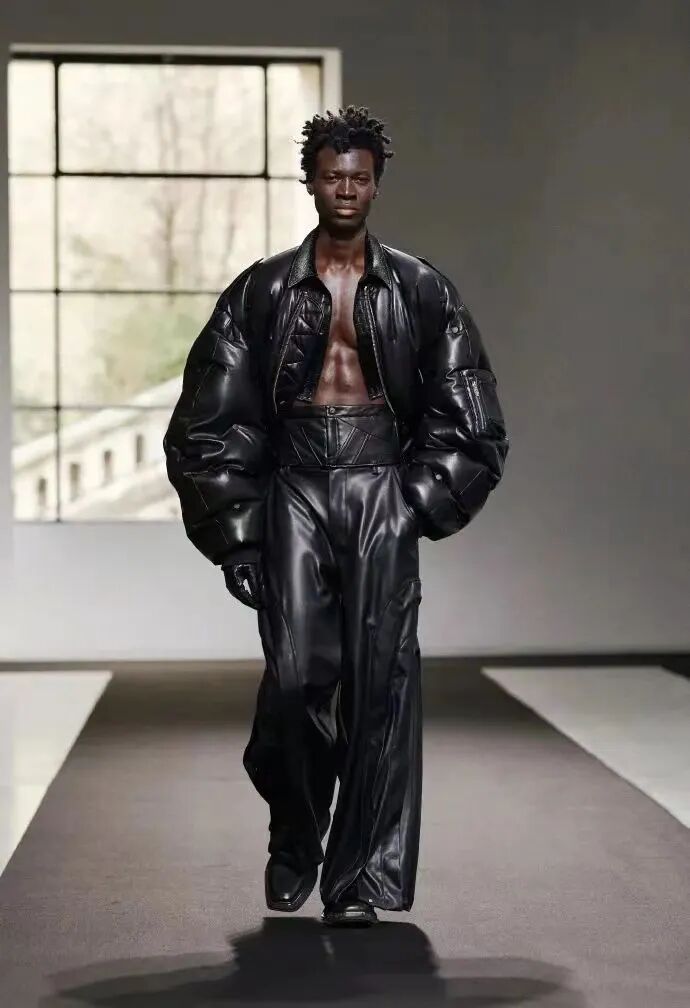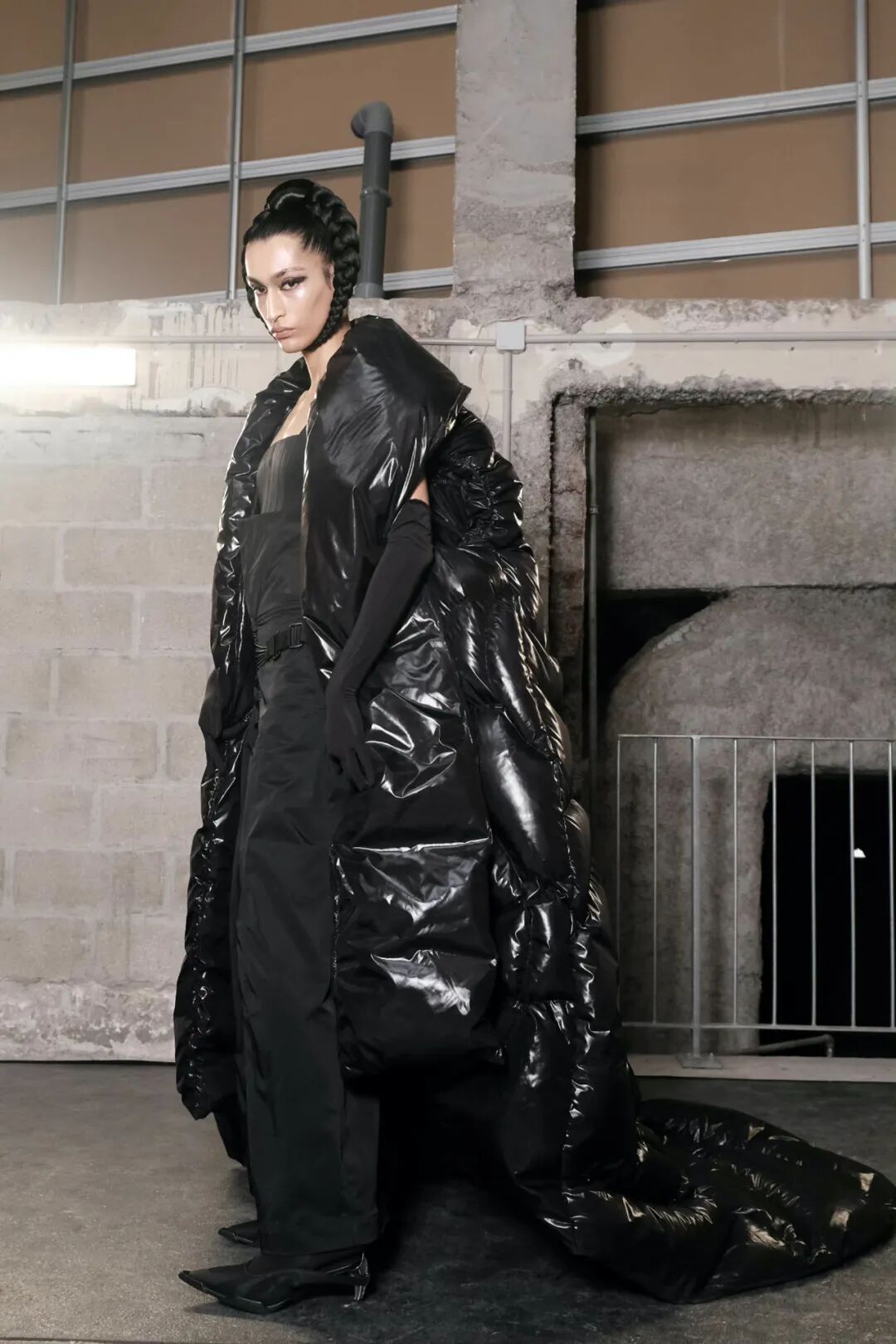全新的CHENPENG羽绒礼服系列,全系列黑色为主色调的时装系列中,选用人造水晶、仿生鳄鱼皮革、丝绒提花、回收尼龙等可持续材料,以环保的方式增加时装视觉立体度与高级定制奢华感,传统防寒的羽绒服被赋予了新的场景可能。