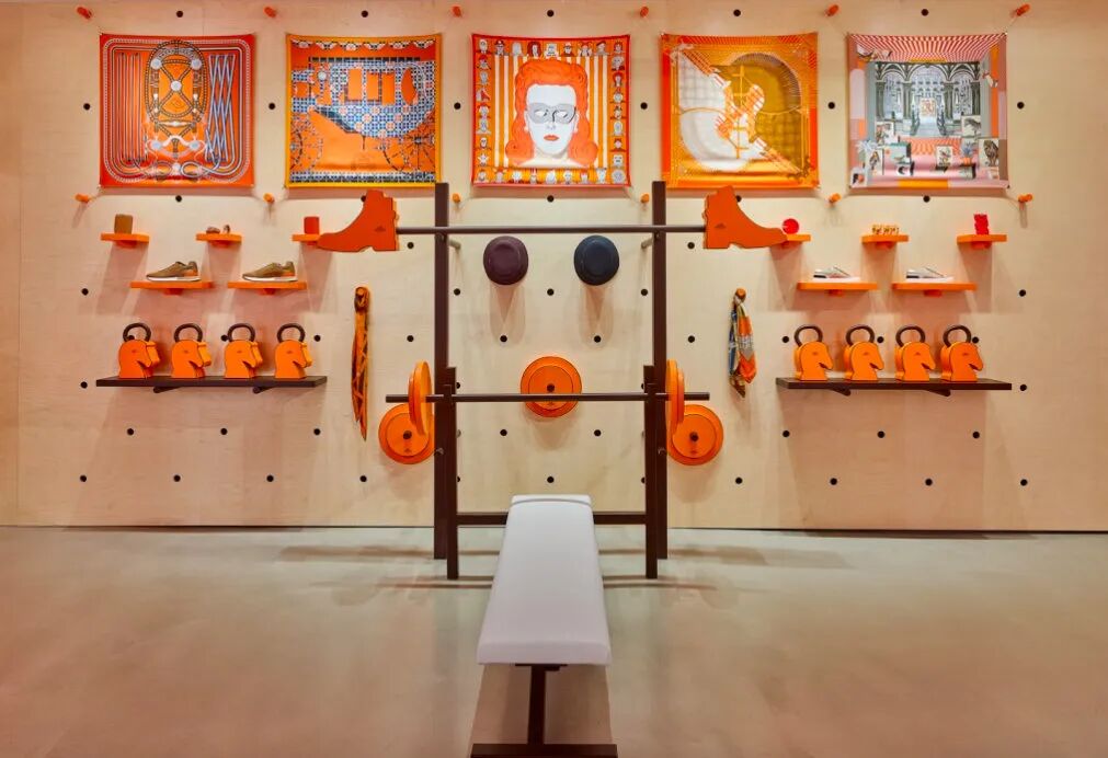 而爱马仕则是在成都远洋太古里开出全球第一家快闪健身房HermèsFit。它不同于传统爱马仕门店凸显的展卖功能,而是在空间内打造出沙袋锻炼区、拳击擂台区、攀岩墙等,杠铃、壶铃等健身工具采用品牌造型的「马头」,整个空间宛如「健身房」。