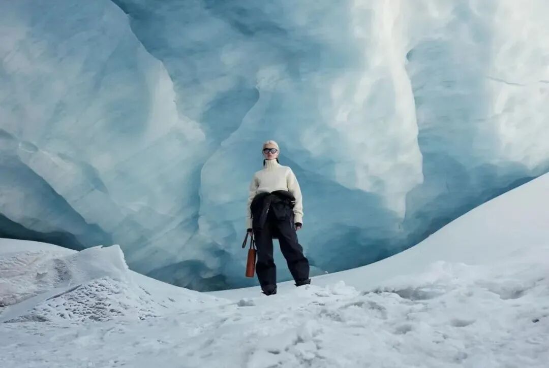 这一季的秀场就已经把滑雪氛围拉满了,秀场设在白雪皑皑的阿尔卑斯山脉,主题为「Brave Hearts」。模特们以大自然作为背景,在这绵延不绝的白雪上,展示了几十套滑雪装备。