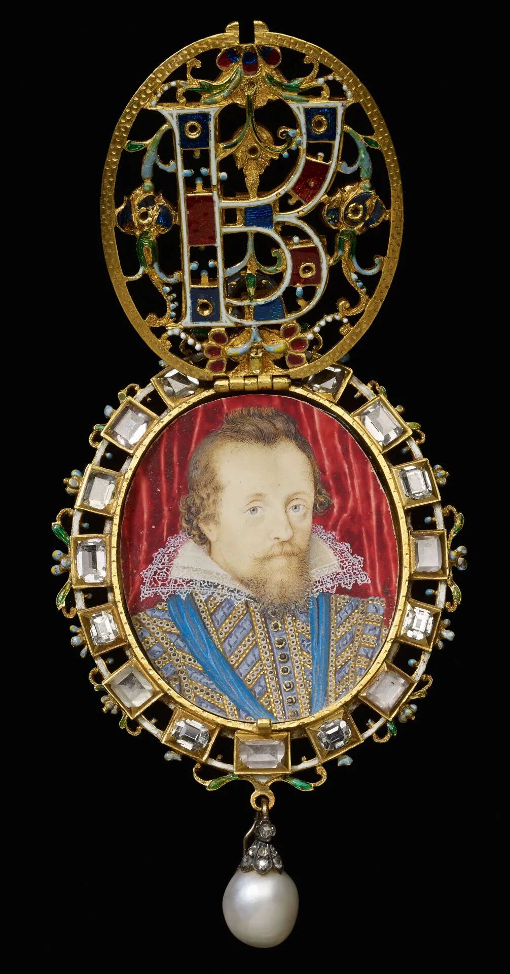 这件黄金镶钻珐琅彩锁扣挂坠,属于英国第一任斯图亚特家族的君王詹姆斯一世。字母图案是王室字母交织花押字"IR"的组合,源自拉丁语“Iacobus Rex”的首字母,也是君主、帝王的意思。