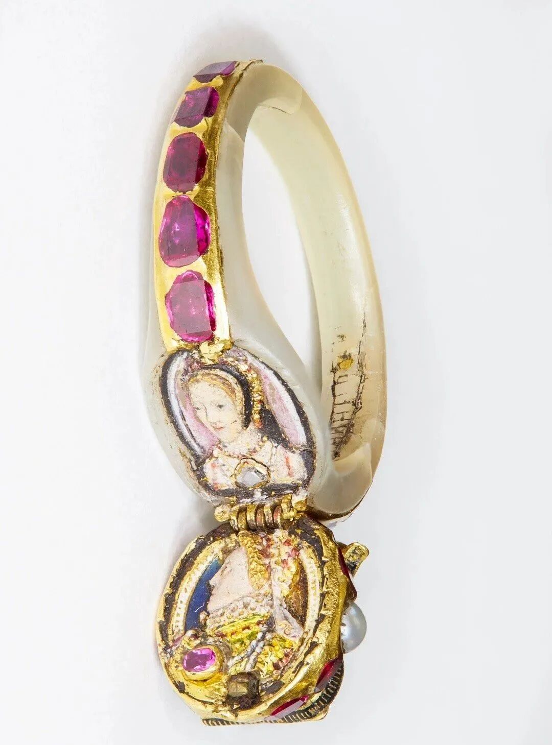 打开这枚戒指,会发现里面藏有两幅肖像,下面这幅是女王,上面那幅是安妮·博林。
