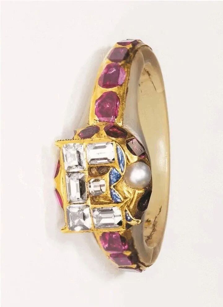 上图这一枚1570年代的戒指,属于安妮·博林的女儿,伊丽莎白一世女王。戒指上面镶嵌着镶嵌黄金、珍珠、红宝石、钻石,并用宝石拼写出女王的名字缩写ER。