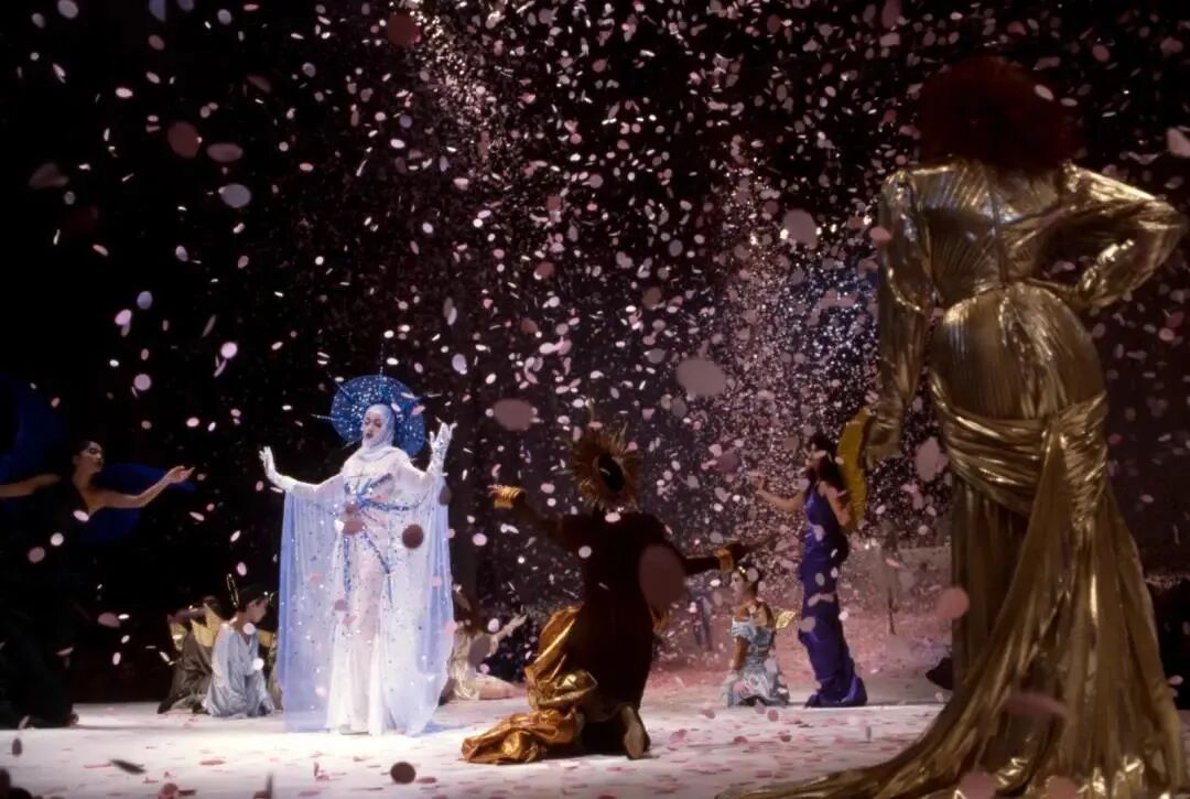 在时装秀结束的时候大把大把的鲜花从天空中散落下来形成浪漫的花雨,或者是雨水直接从天而降,淋湿了所有站成一排谢幕的模特们,这些都是Mugler时装秀的经典画面。