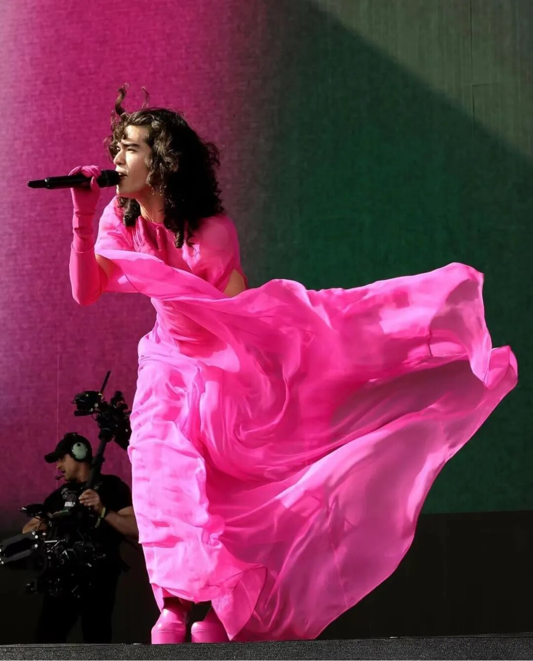 四月初的Coachella音乐节上,音乐才子Conan Gray就身着「Valentino Pink PP」系列透视长裙登台献唱。Valentino极高饱和度的粉色被Conan Gray演绎出一种无性别的美感,飘逸的透视纱裙在风中摇曳,让Coachella更加浪漫自由。
