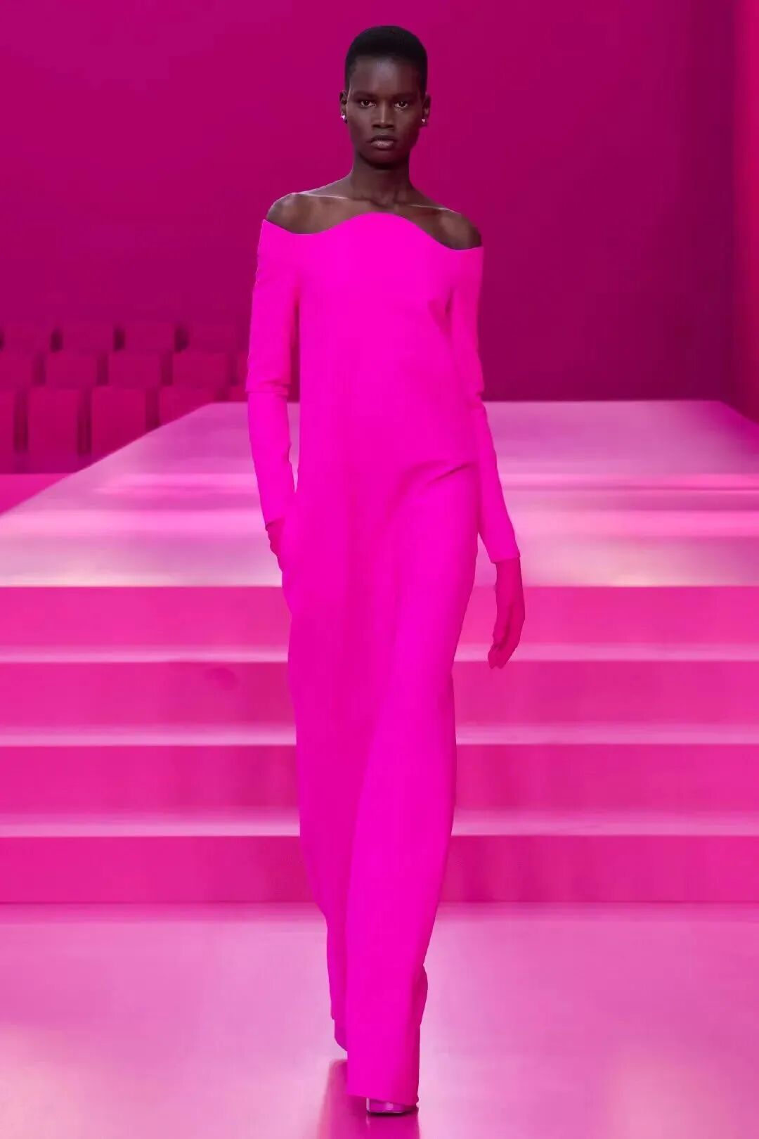 在大秀开始前,巴黎街头就被布置上了随处可见的大型Valentino粉色标语广告,一次又一次吸引着人们的注意,而整个秀场也被设计成了一个巨大的粉色装置空间,人们视线所及之处都被粉色所包围着。