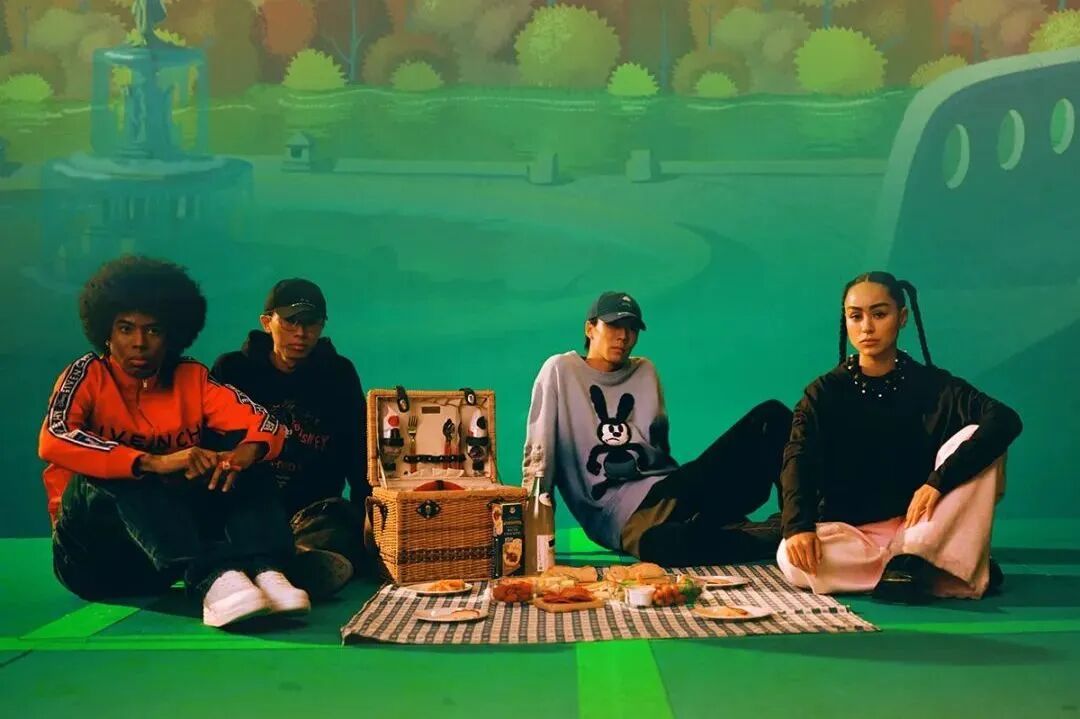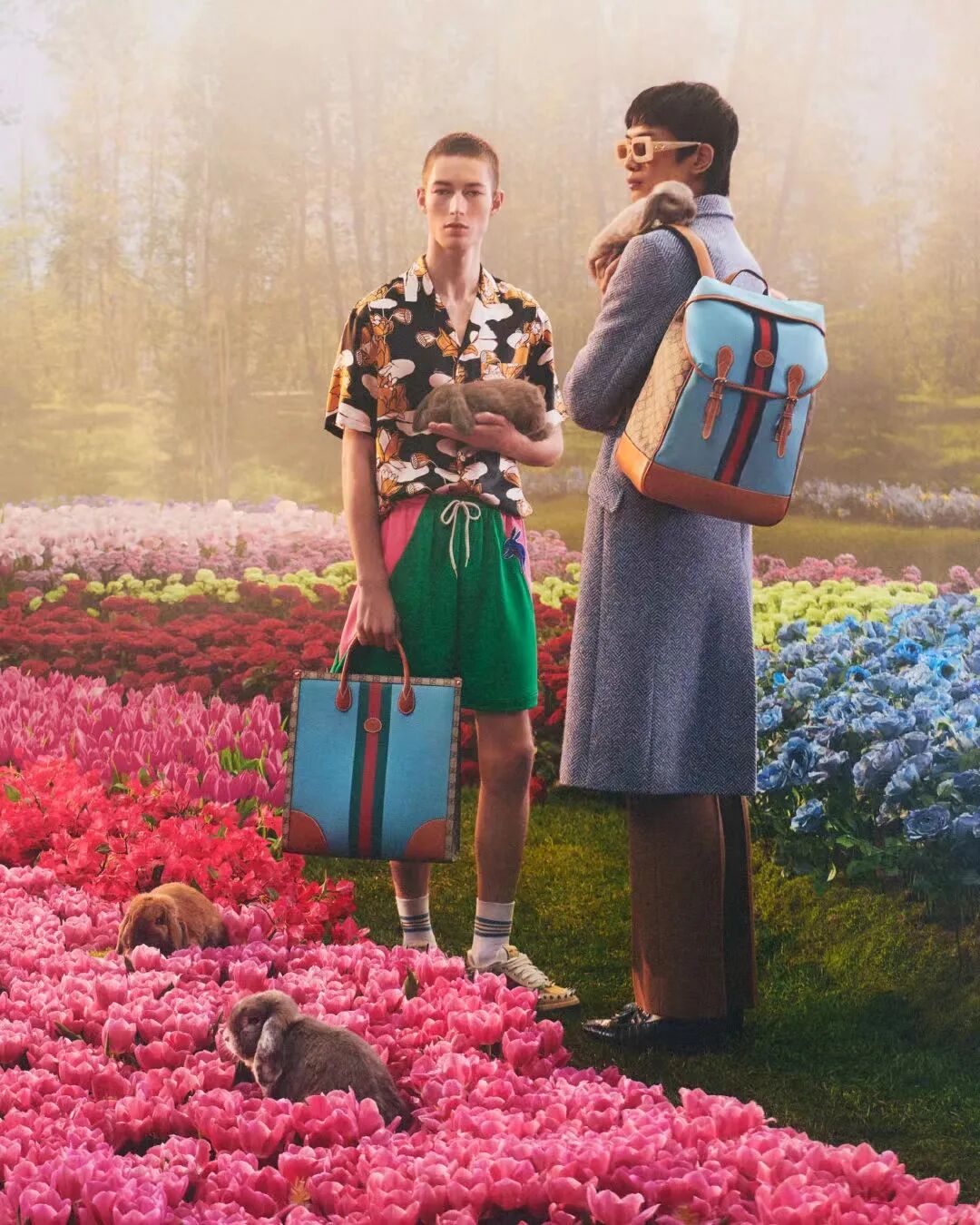 在Gucci的新春大片中,人们在如梦如幻的花田中遇到了兔子,繁花簇拥,颇似掉进了爱丽丝的兔子洞,日出的柔和光线预示着新一年的到来。