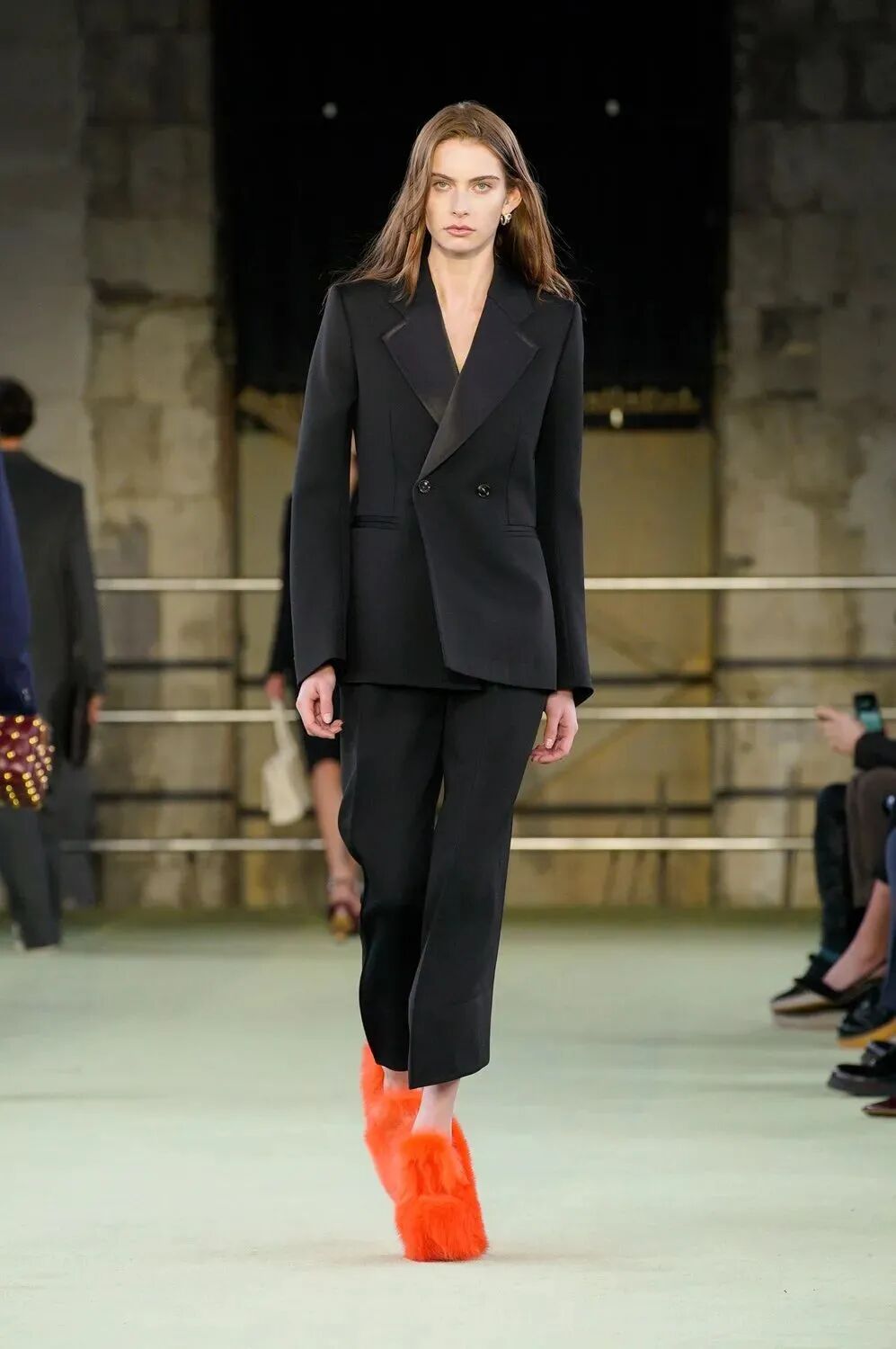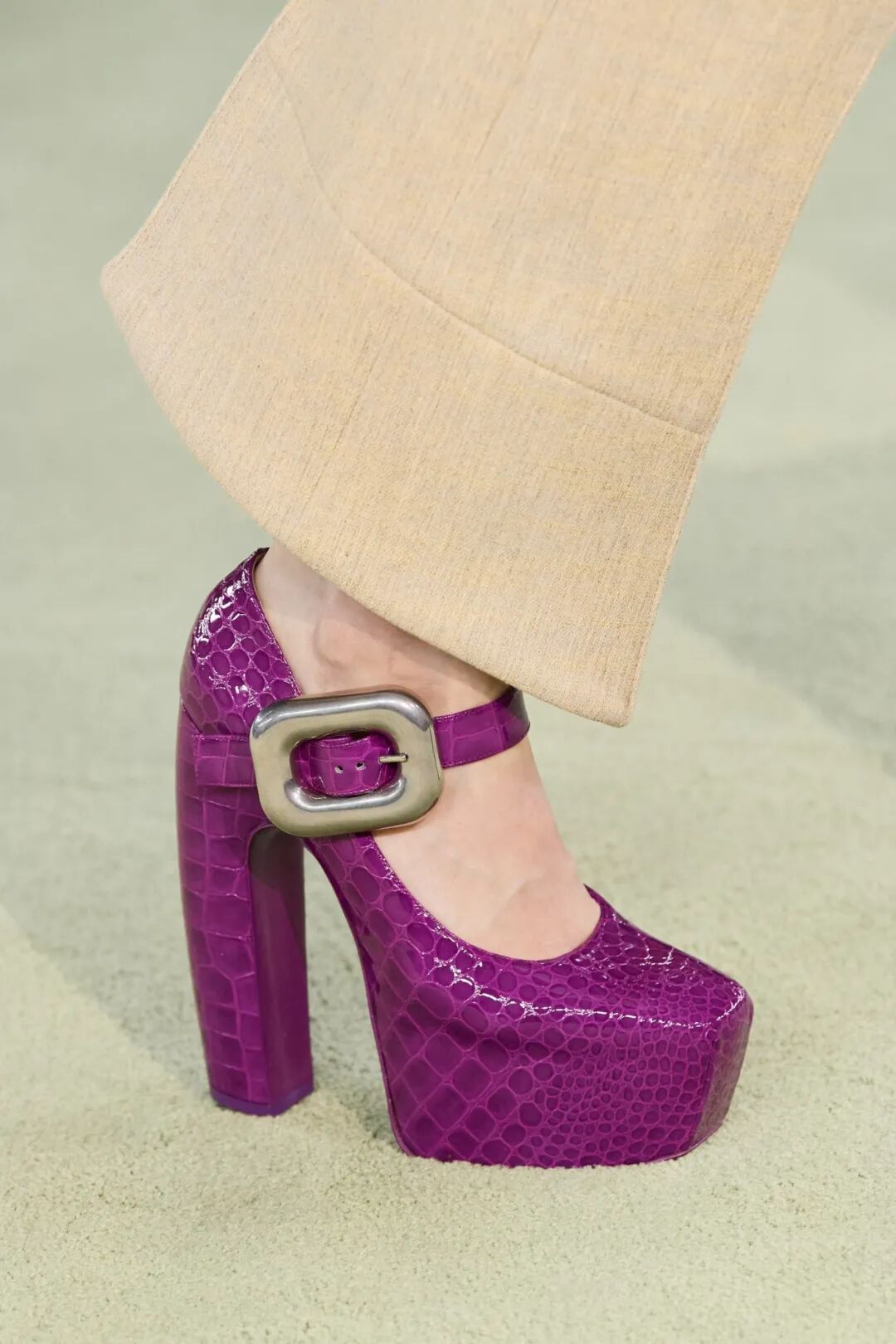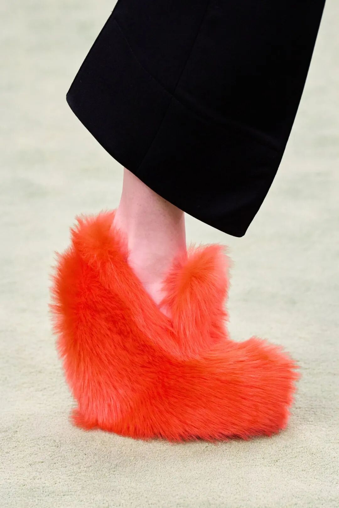 而高纯度的明亮色彩也更多地被挪用到了鞋履上,同沉稳的着装风格形成对比,将人们的眼球吸引至足下。无论是高跟玛丽珍抑或由皮草加持的高跟鞋,都凸显Bottega Veneta兼具艺术与实用的特性。