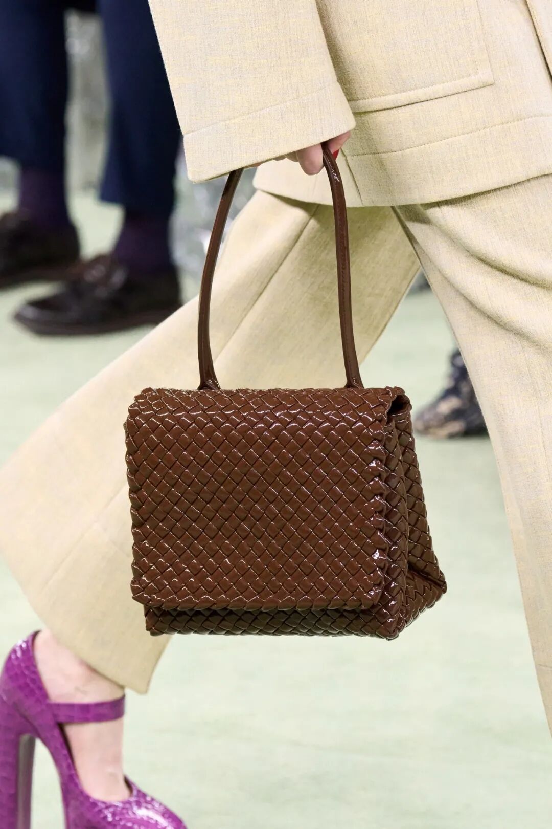 手工编织皮革仍然是本季配饰的亮点所在,每一寸编织工艺都代表着一个独一无二的故事,以粗细不一的形态勾勒出包袋与鞋履的自然轮廓。而这也正是Bottega Veneta的精神内核所在:一种对日常物品的情感投资。