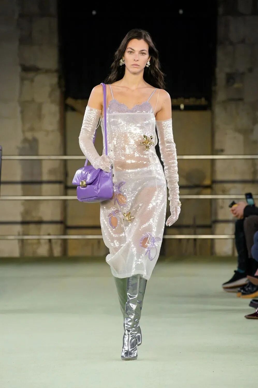 亮片及镂空元素与低饱和度色彩一同勾勒出源于20世纪80年代的disco风情,在BV的风格诠释下性感却不显张扬。吊带抹胸内衬为整体造型平添了几分层次感,Matthieu Blazy试图让前卫多元的面料渗透进日常生活,探索身体与时装间默契的情感联结。