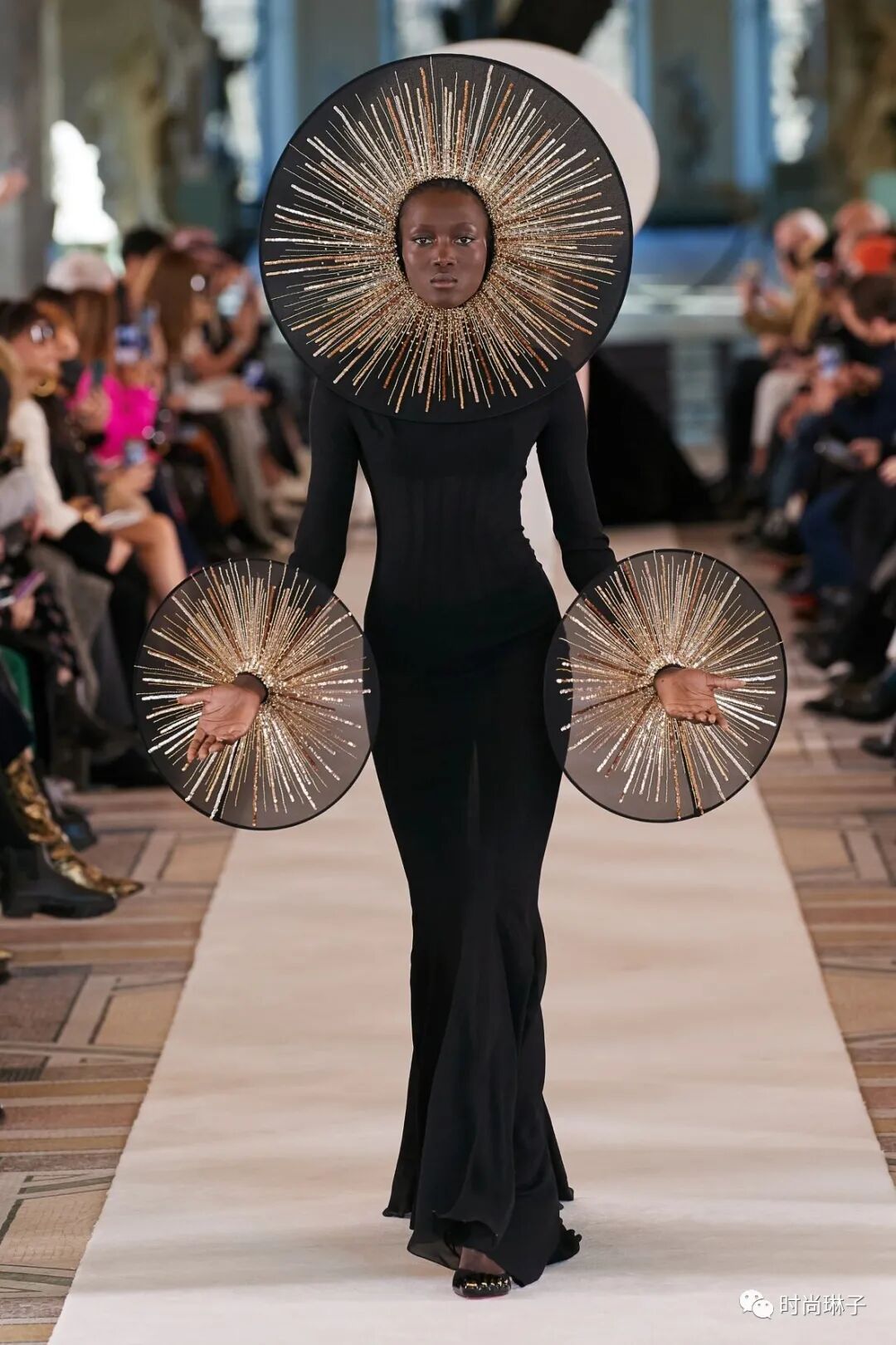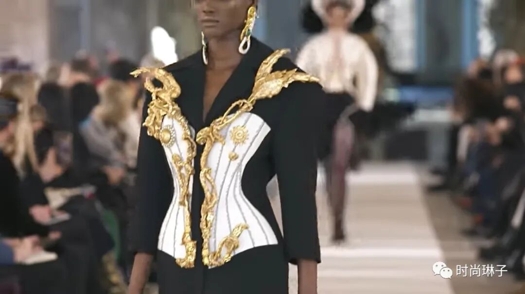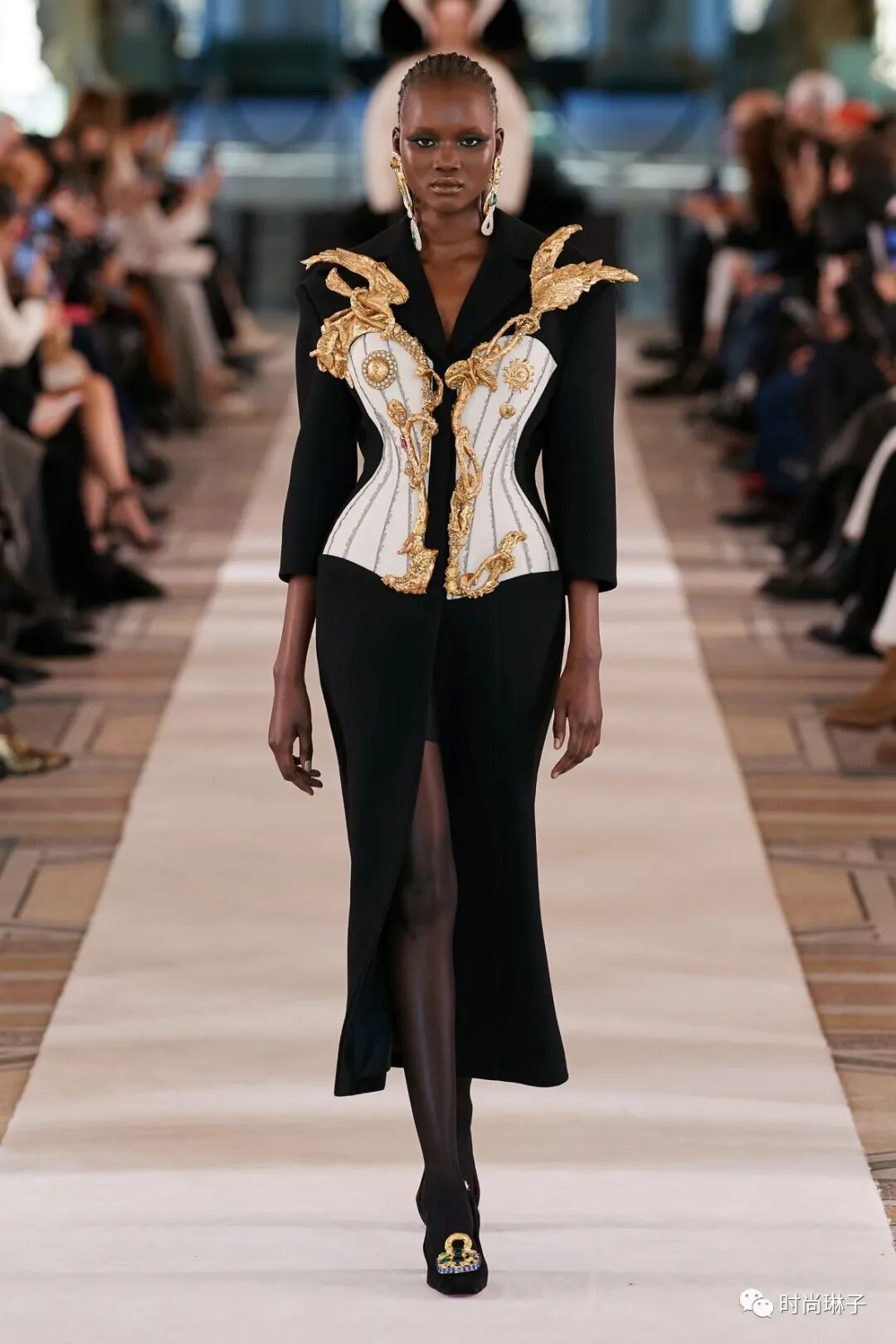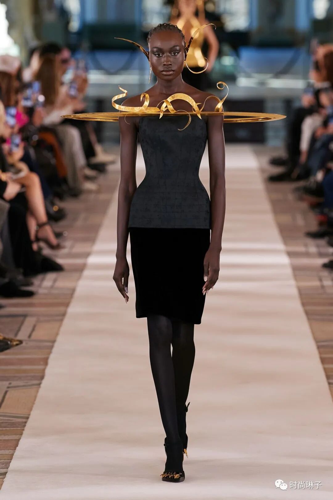 Schiaparelli 2022春夏高定系列将对立的二元性通过黑白两个颜色以及虚实材质的混搭组合来表达,搭配品牌标志性的金色刺绣和贵金属嵌件或配饰,延续了超现实主义的哲学概念。