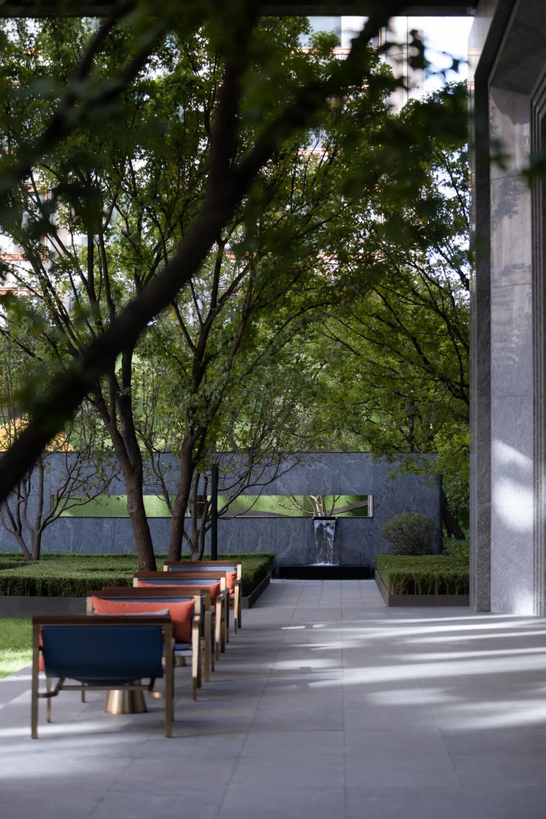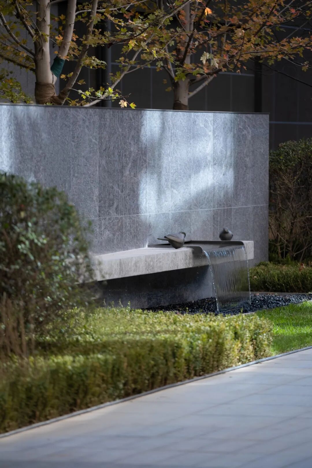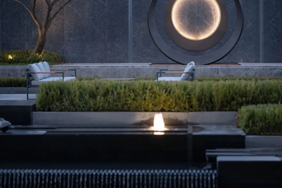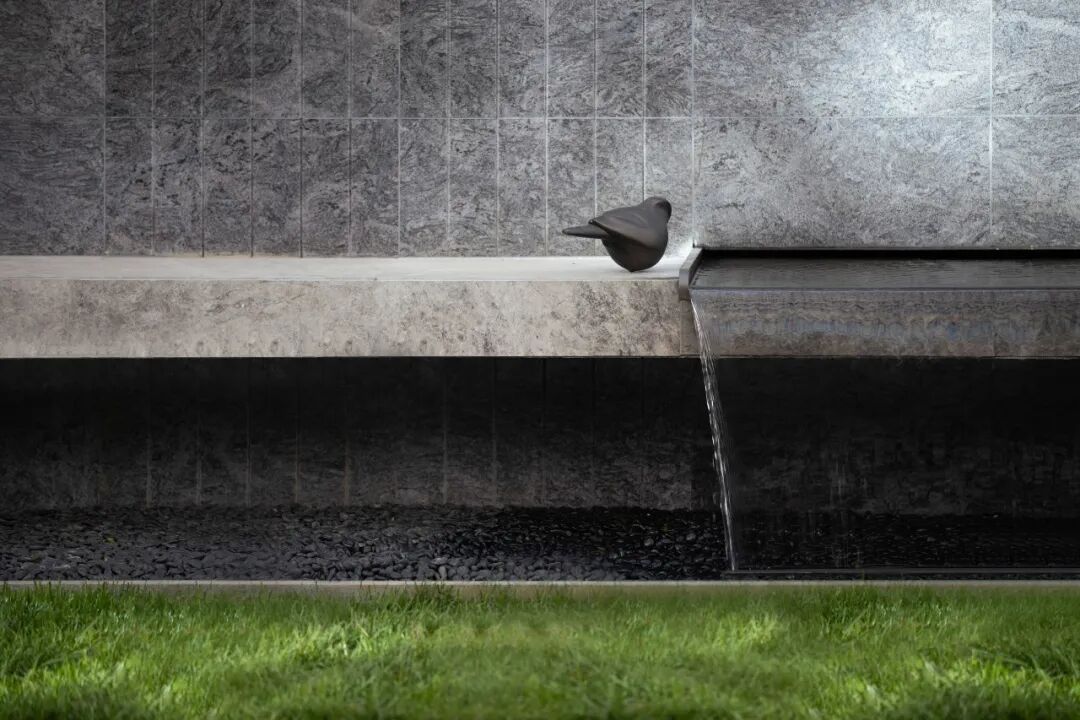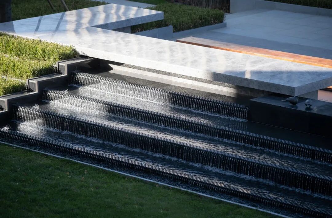 与线条和块面构成的场地不同,独有的雕塑与细腻的水景让空间中散发出一份温暖与精致感。远闻潺潺落水声,近观灼灼日光转,让景观渗透到不同的空间中,让人们感受空间的层次感。