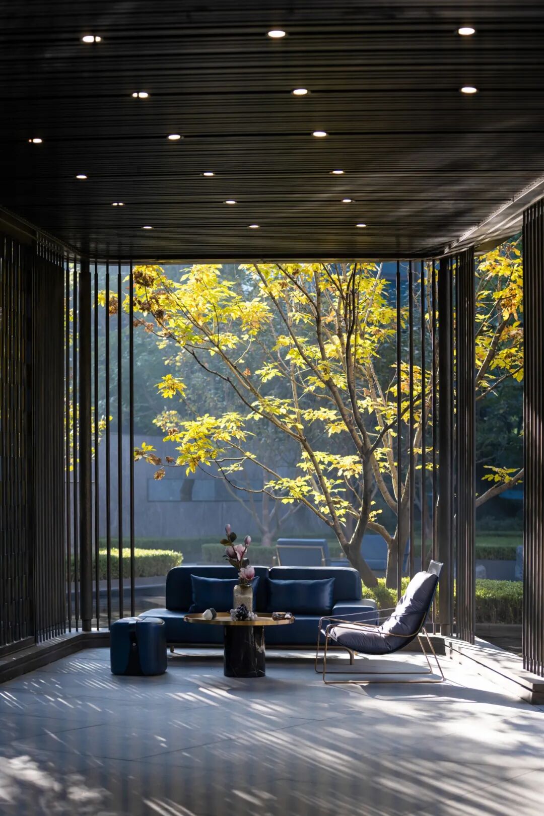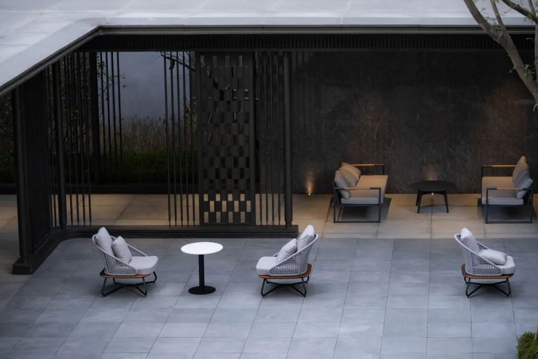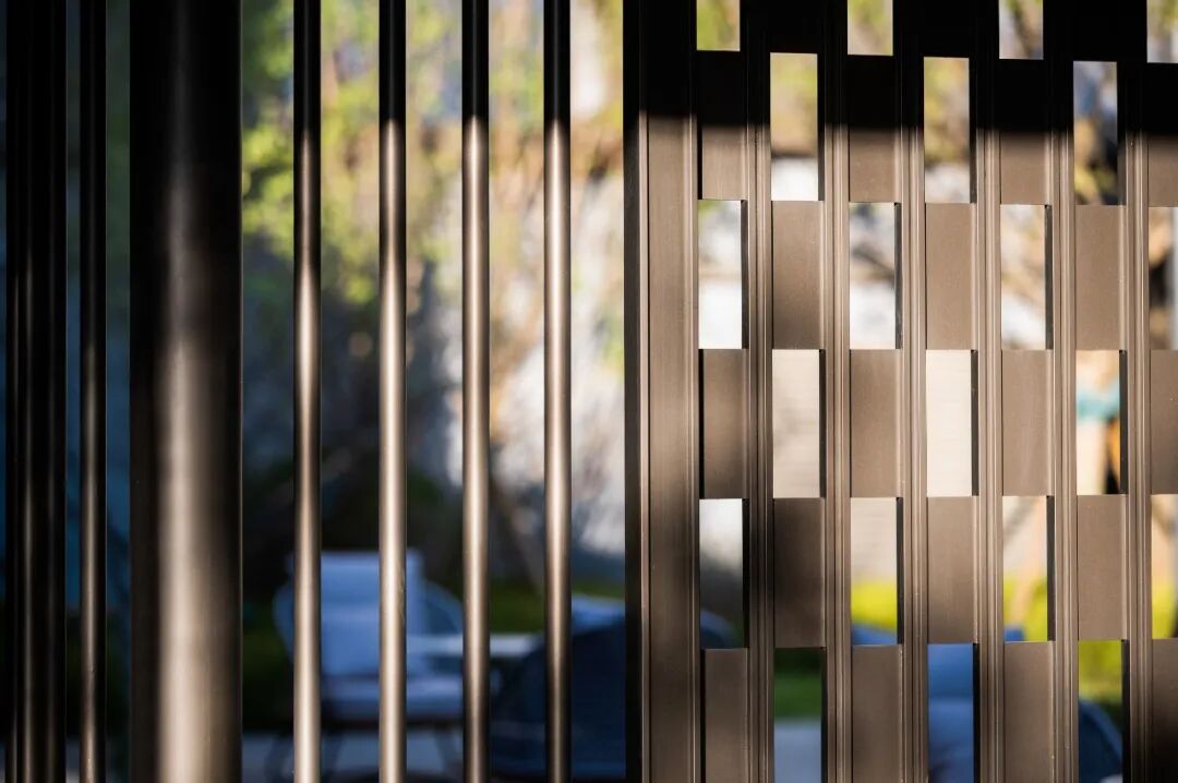 这里是与外界形成反差的平静空间,廊架的比例、材质、大样也沿用了展示区的风格,将之前的设计总结汇总,形成了一套完整的做法,保证了项目更加高效、完整的落地。