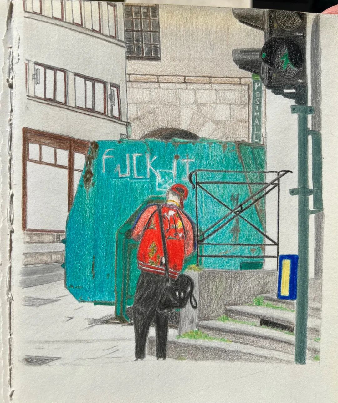 “搭档封闭期间在家无聊的涂画,是我的背影,原图在斯德哥尔摩”