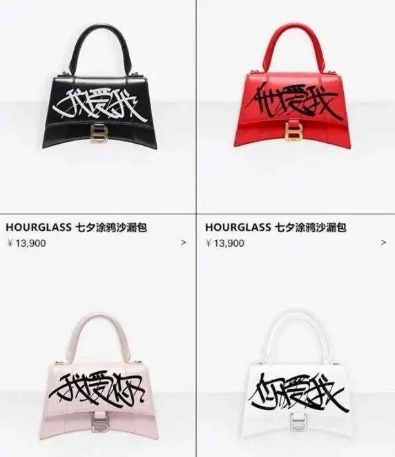 除“生活化”外,“丑”这个元素则是刻在了近年巴黎世家的新品基因里。早在2020年,巴黎世家设计了四款七夕限定沙漏包,红、黑、粉、白四种不同颜色的包上分别印着“我爱你”、“你爱我”、“我爱我”、“他爱我”,因配色和文字设计让这款产品“一丑出名”。
