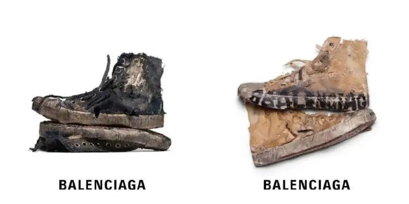 就如今年5月,巴黎世家推出“Paris”系列高帮运动鞋,该鞋本身有部分被划烂,并伴有瑕疵和脏污,就如同在垃圾堆里找到的“破烂乞丐鞋”。官方在品牌营销上则赋予了“环保”的意义:“在快销产业和过度消费影响地球的当下,Paris系列是一记强而有力的警钟。”
