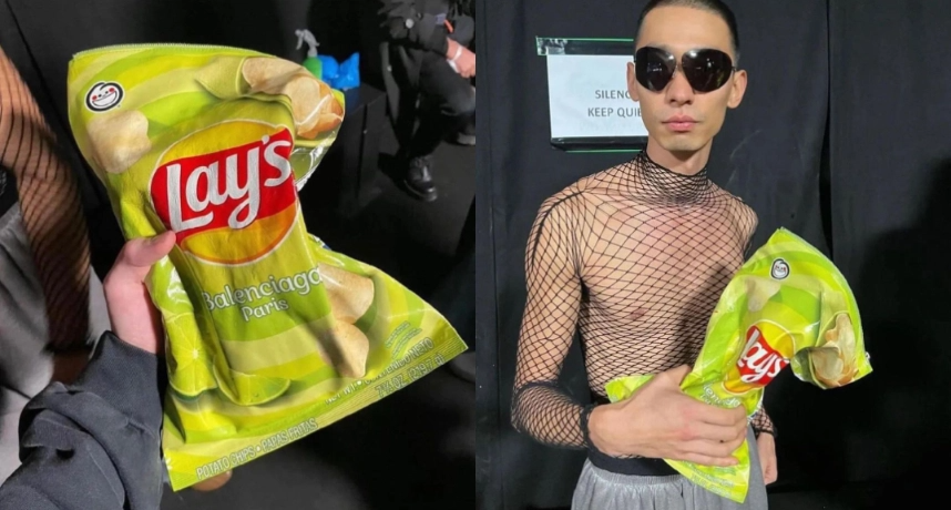 巴黎世家推出的「乐事薯片包」是由巴黎世家2023年春夏大秀上,由Kanye West的保安服造型Look开场的模特带上秀场,当场就吸引了不少人的目光,而这也正印证了那句话:“奇葩设计千千万,巴黎世家占一半”。