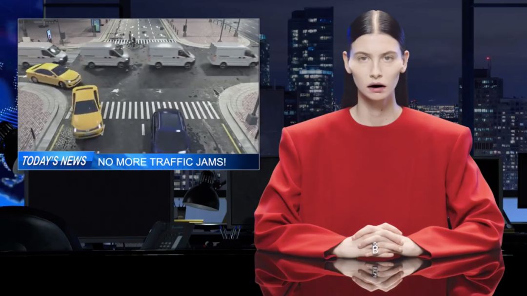 短片以新闻联播的形式分别讲述了行星重叠、水去哪儿、交通不再拥堵、行人归来和太阳镜日五个现象,去探讨环境与科技、和谐与延续的人类福祉命题,延续了巴黎世家一贯的以荒诞的视角让人审视未来的创造风格。