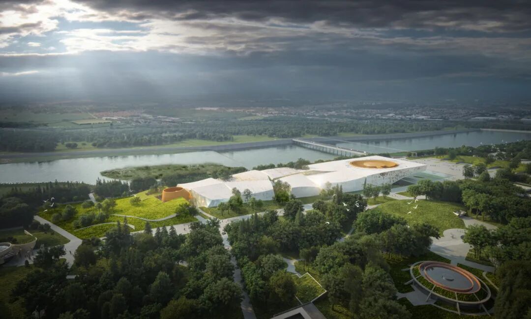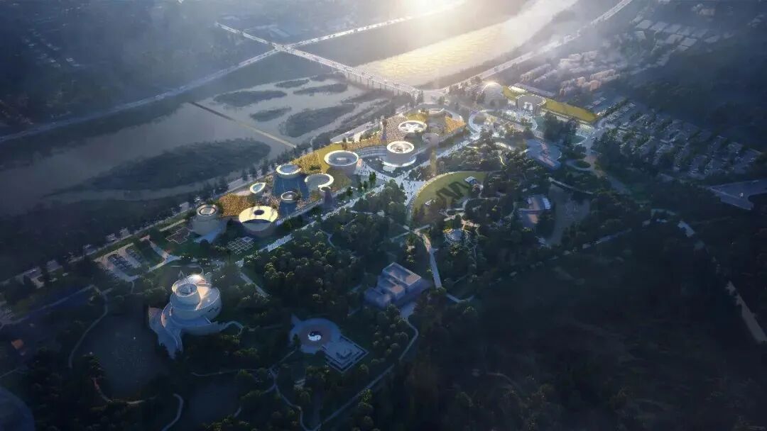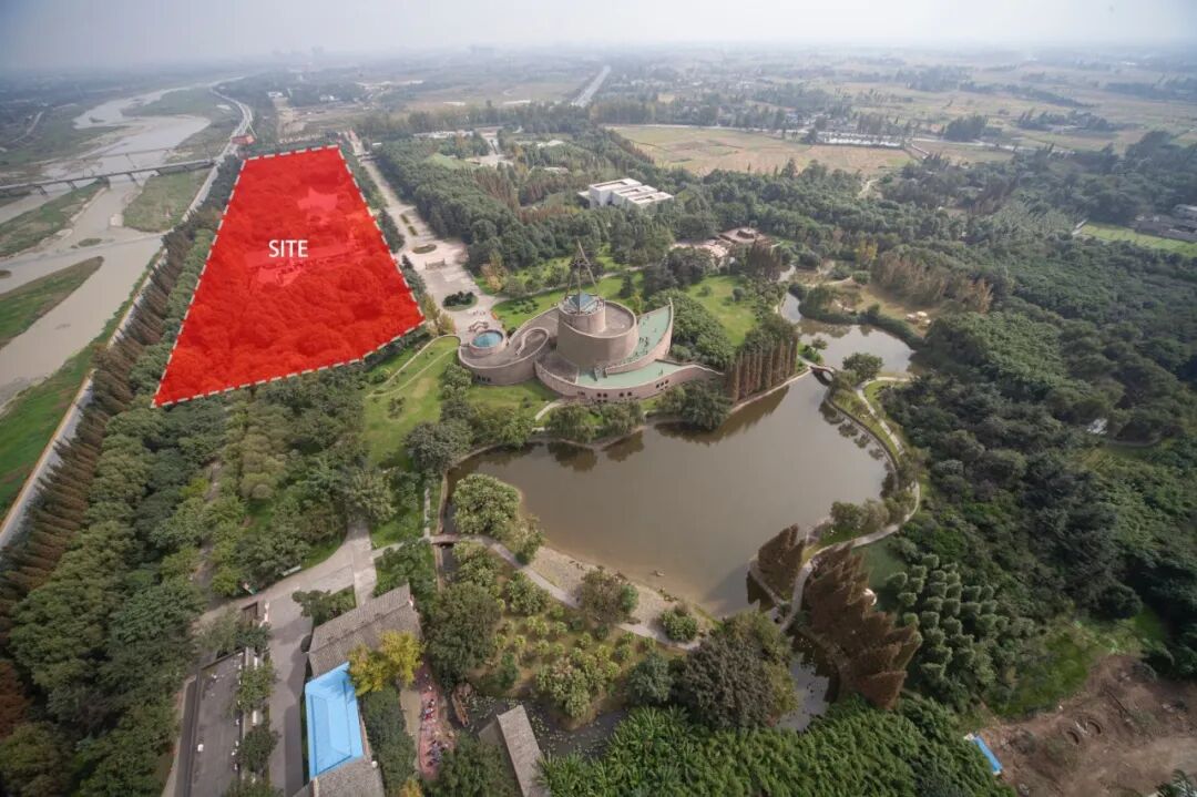 自 2019 年 11 月三星堆遗址的全面勘探和重点发掘重新启动,不断有新的考古成果并有文物重器出土,三星堆遗址考古进入新时代。现有的两个展馆,共计 1.08 万平方米建筑面积已无法容纳新文物展示,博物馆新馆的建设计划提上日程。此次概念设计规划用地范围位于遗址核心保护区东北角,总占地面积约 7.5 万平方米,新建博物馆及游客中心总面积约 54400 平方米,建成后的新博物馆将与现有的一、二号馆共同组成三星堆博物馆群,打造展陈形式多样化、现代化的世界级专题性博物馆。