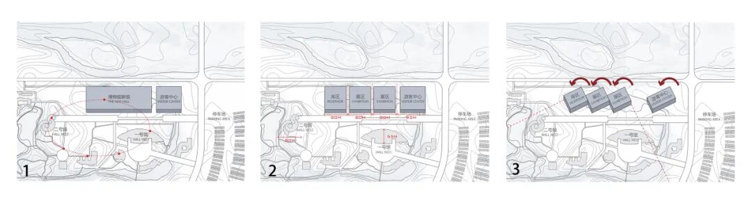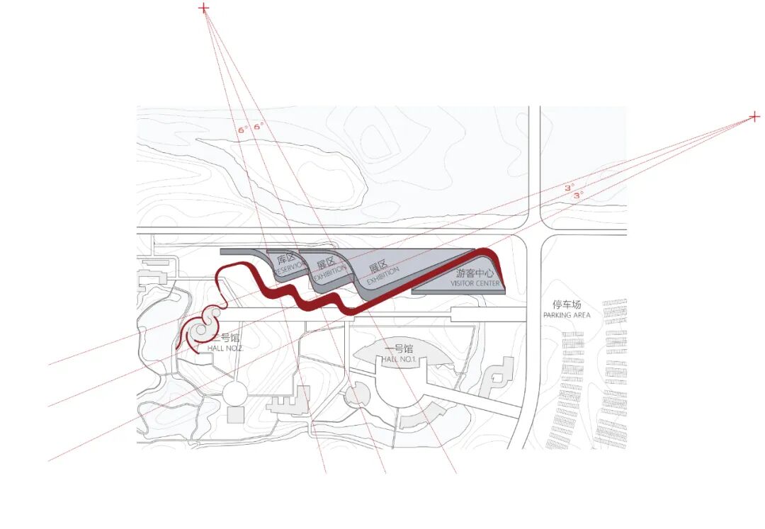 设计将老馆经典的螺旋曲线外墙延续发展,作为三个堆体外形和空间的控制曲线。屋顶采用斜坡覆土形态,建筑消隐的融入场地,与对面一号馆斜坡形体左右呼应,建筑形成三个沿中轴排列的覆土堆体,寓意“堆列三星”。三个堆体的平面控制线延长相交于一点,平面夹角呈现严谨的几何逻辑,生成独特的形体韵律。