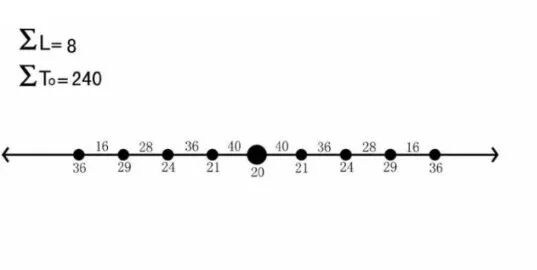 我们发现:(1)在人口规模(点数)相等的情况下,棋盘式路网的总出行距离是144,而带形城市出行的距离则高达240,表明棋盘式路网对于私人出行来说更经济;(2)同样的人口规模,棋盘式路网的道路长度是12,高于带形城市的8,表明带形城市基础设施投资较少。因此,带形城市在以私人交通为基础的交通方式下,不如棋盘式路网效率高,但基础设施却相对“节省”[1,注释见后文];(3)棋盘式道路上,最大交通负荷只有14,而带状城市最低的路段负荷也超过16,接近中心区的路段负荷高达40,表明同样的人口,带形城市的道路要“拥挤”得多,如图3所示。