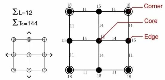 现有大多数的城市交通模型,都注意到了城市的密度和公共交通提供的关系,紧凑发展也成为时下西方国家城市空间政策的主流。但是,这些模型往往忽略了城市的形态对不同交通方式同样具有显著的影响。我们比较两个同样是9个人的城市模型,模拟不同形态的城市——一个带形路网的城市群和一个棋盘式路网的城市群的需求特征。在这个简化的模型里,每个人代表一个城市,每个人之间的距离相等,都是1个单位,假设城市群每一个人都访问另外8个人,访问所有点距离最短的区位(标在点上),就是最好的区位。路段长度代表基础设施投入,路段越长,投入越多;路段被使用的次数(标在路段上),代表该路段的交通需求,次数越多,需求越大。