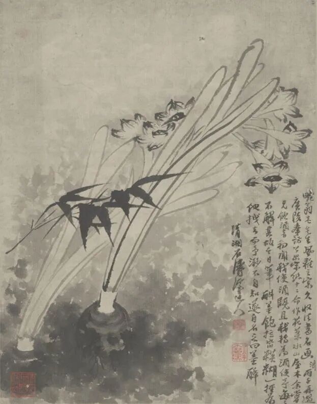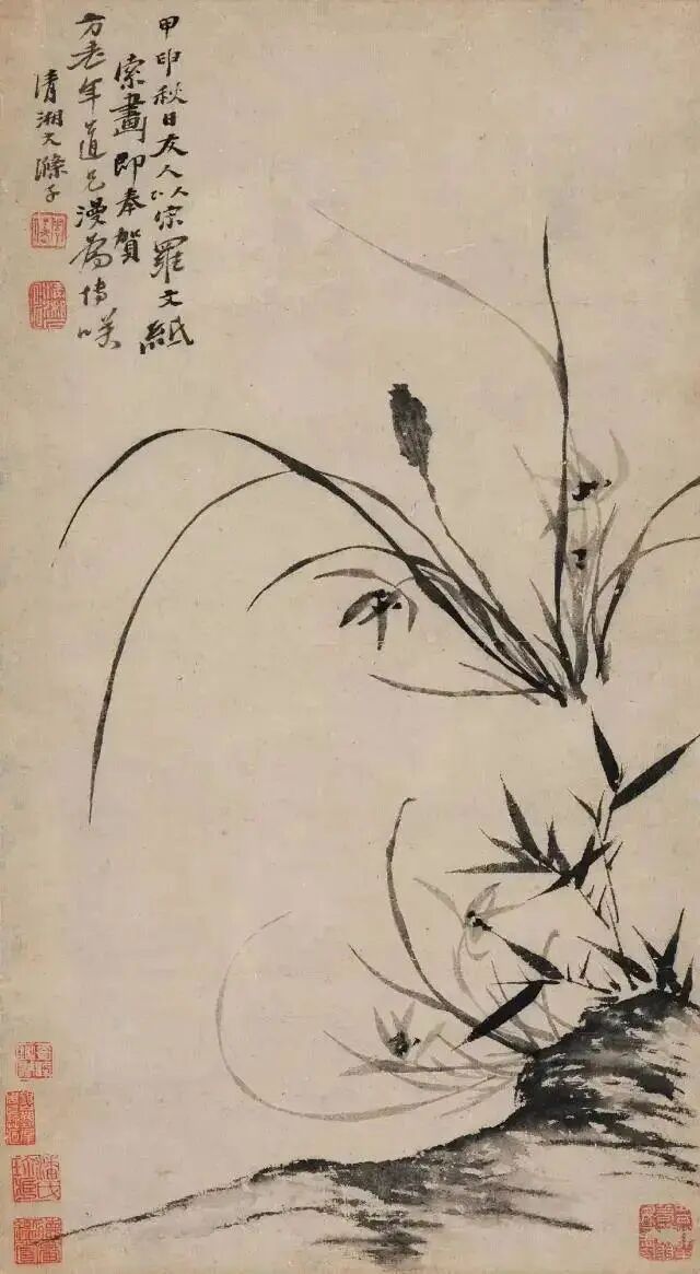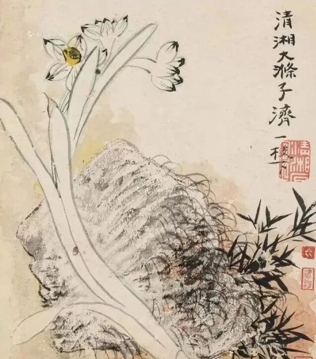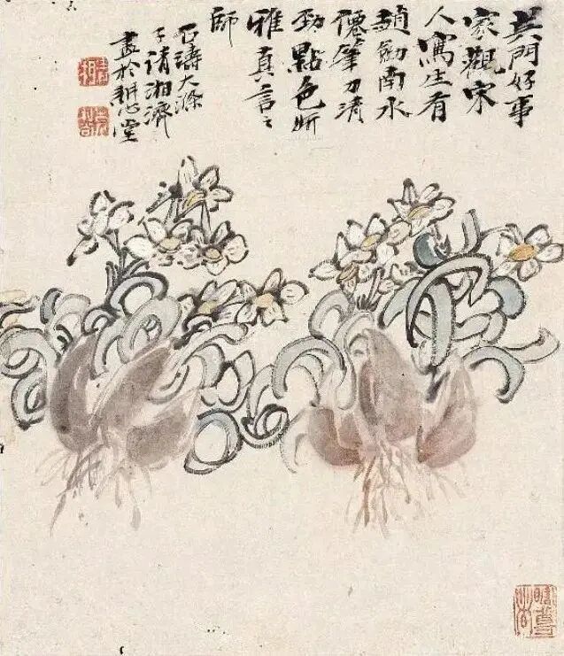 石涛所作花卉,除梅、兰、竹、菊、水仙、荷花外,还有,芍药、绣球、玉兰、桃李之花,品种繁多,或泼墨写之,粗放旷达,纵横淋漓;或设色鲜丽,清秀明亮,婉媚动人。其技法灵活,高深莫测,笔意恣纵,别具生趣,流传至今,被世人视作珍宝。