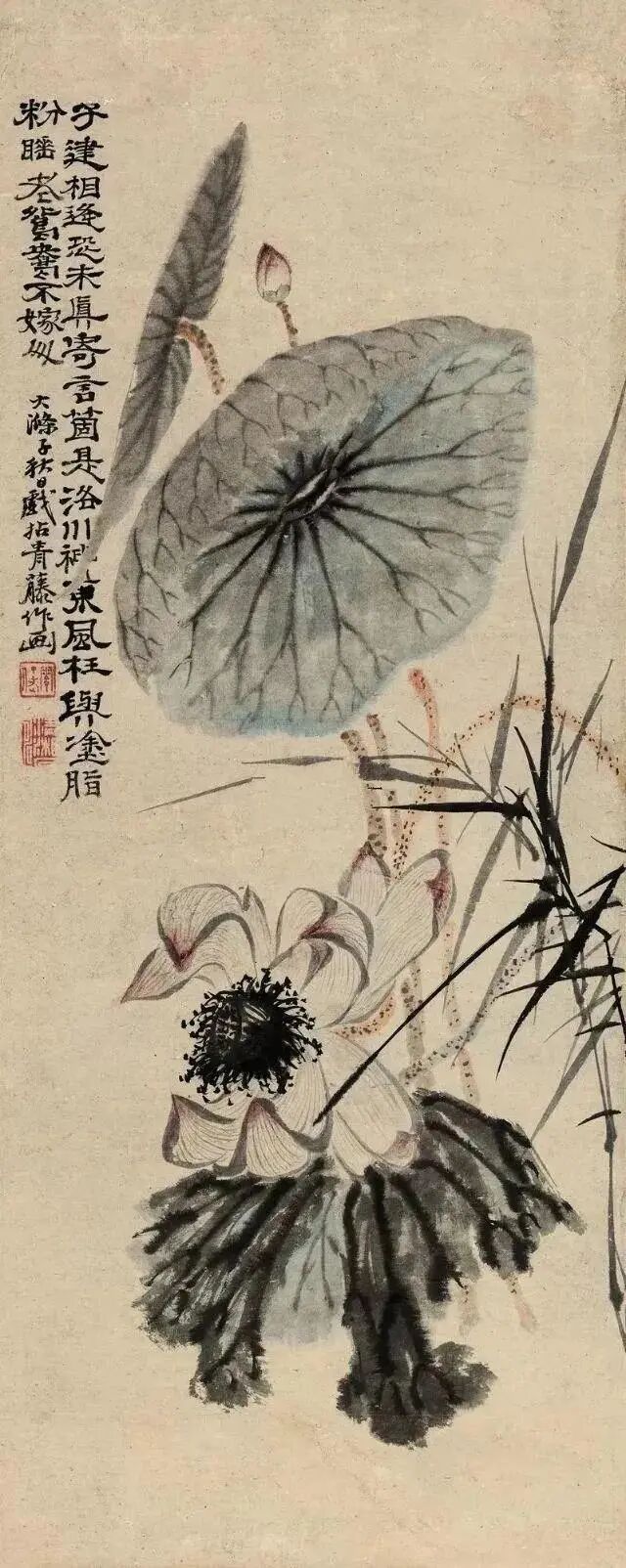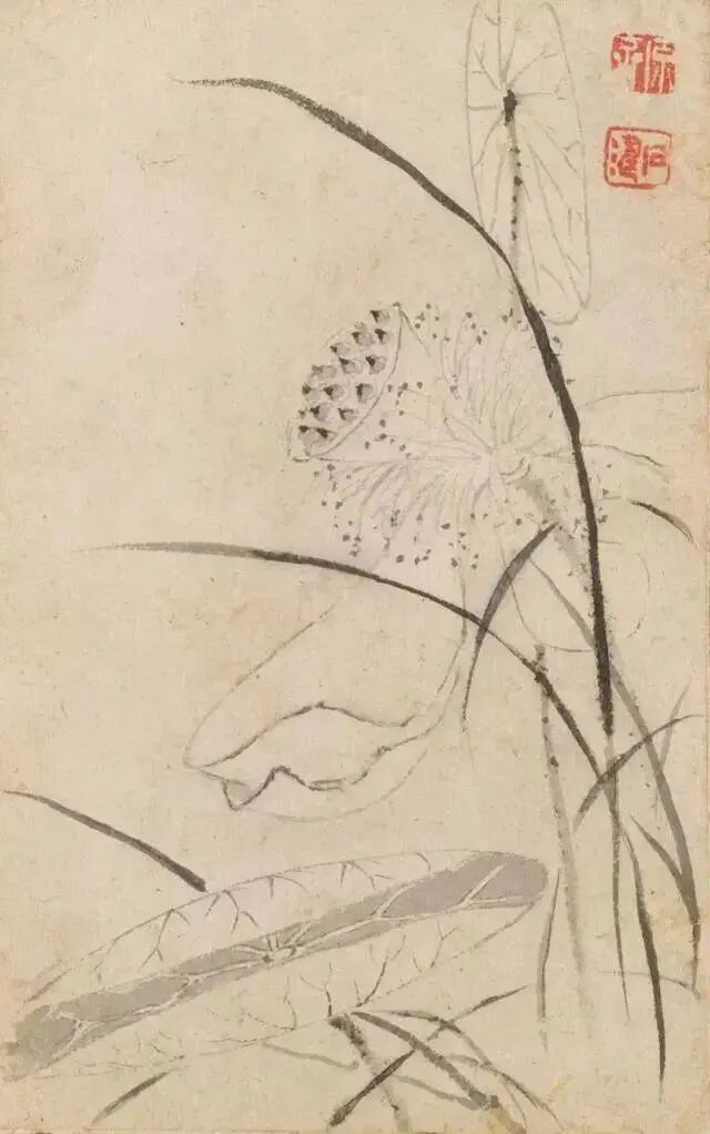 石涛画荷,虽着墨不多,而俯仰盼顾之态,疏密起落之情,安排极为精微。故简而不空,淡中有浓味,淋漓恣肆而有书卷气溢出。