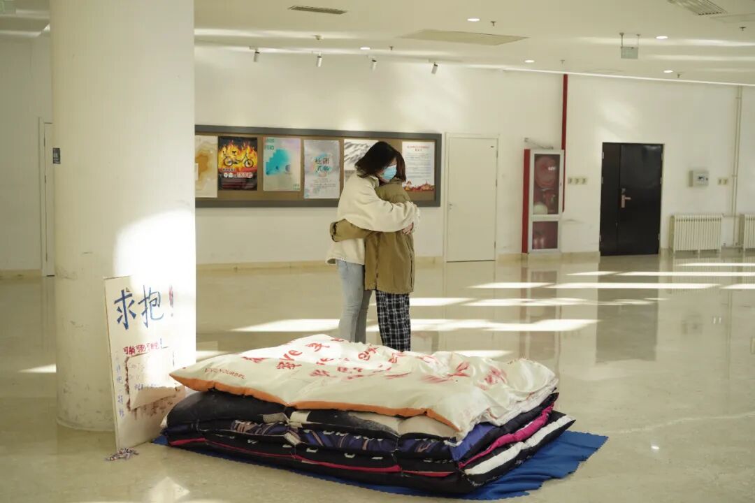 在这个项目中,我在这个行为中所想表达的是一种观察与被观察的状态。我蒙上眼睛,感官放大,完全是一种被大众审查的状态,从自己内心出发,对于这件事情也处于一种模糊的观察。而来拥抱我的朋友,也在观察我的同时被我除了视觉以外的感官观察,就贴合在2021年我对身边的的爱所忽视的状态。