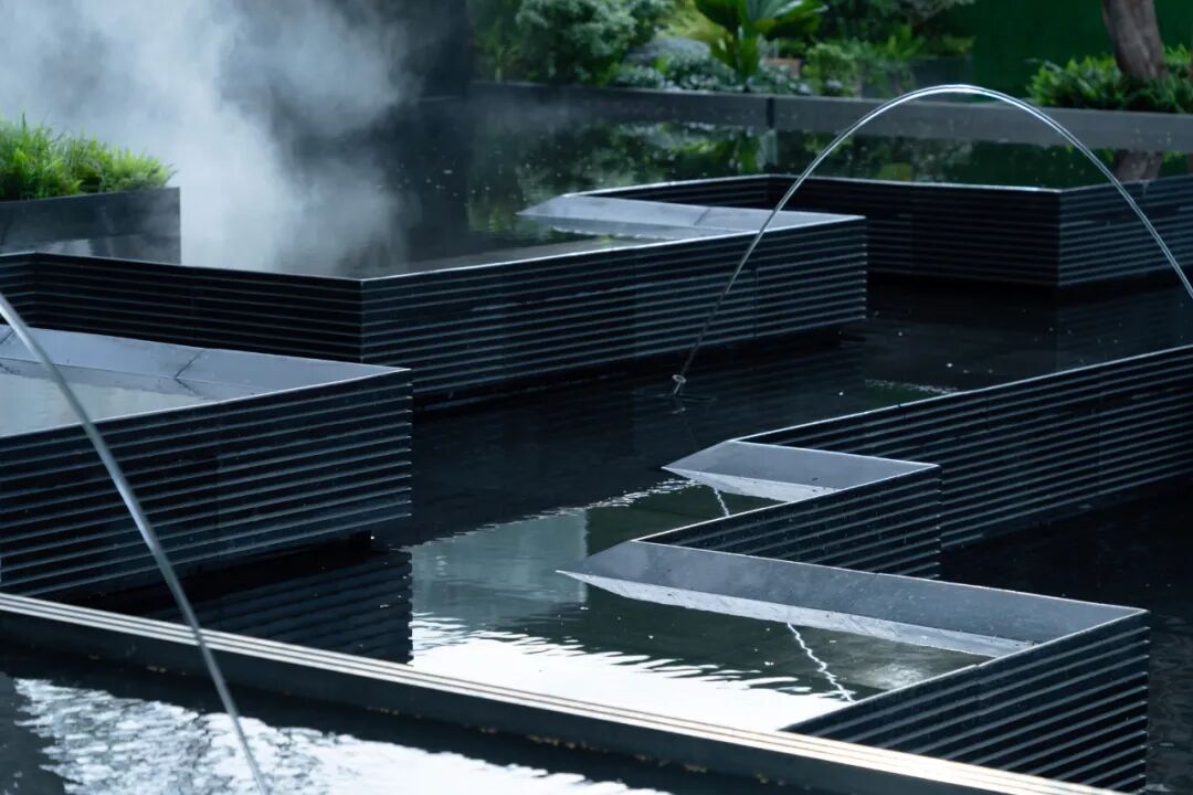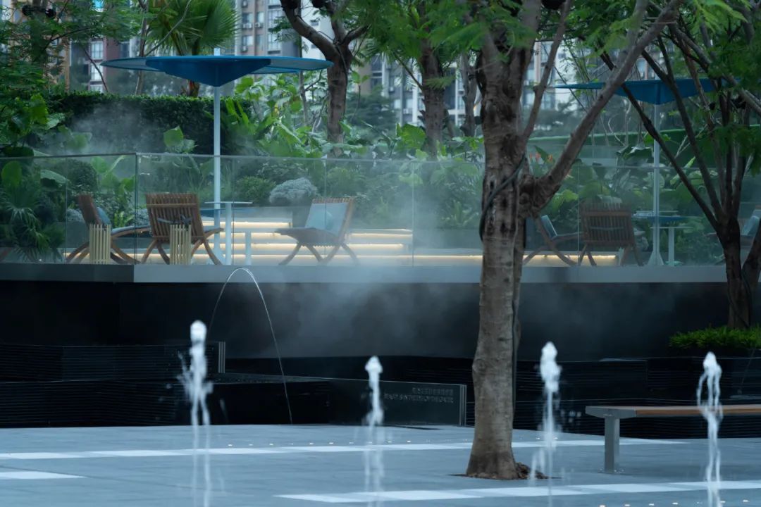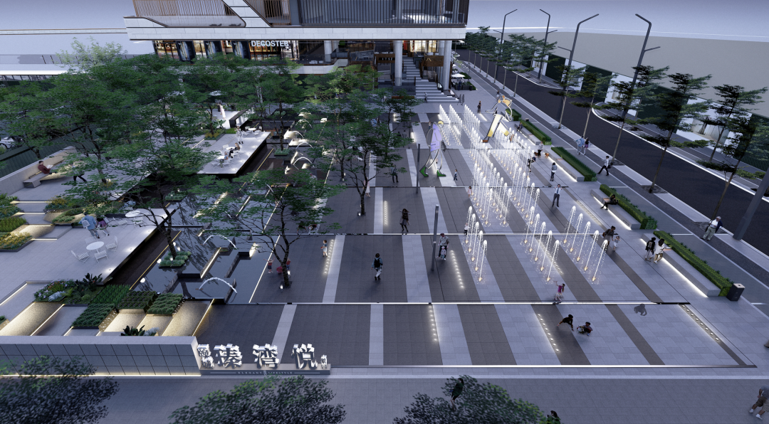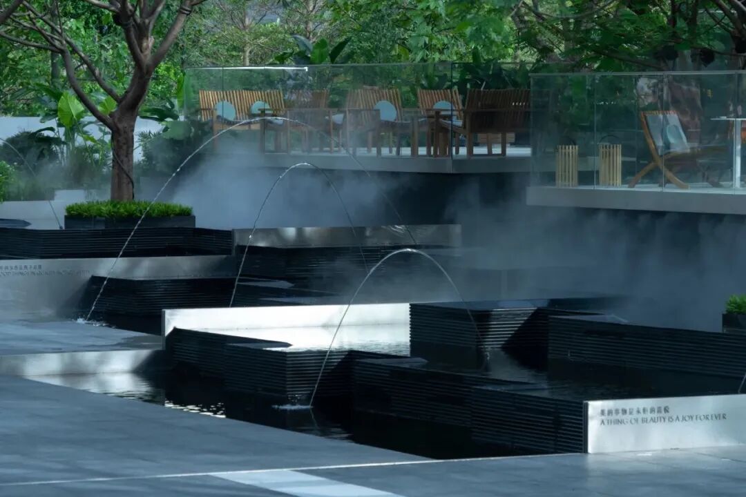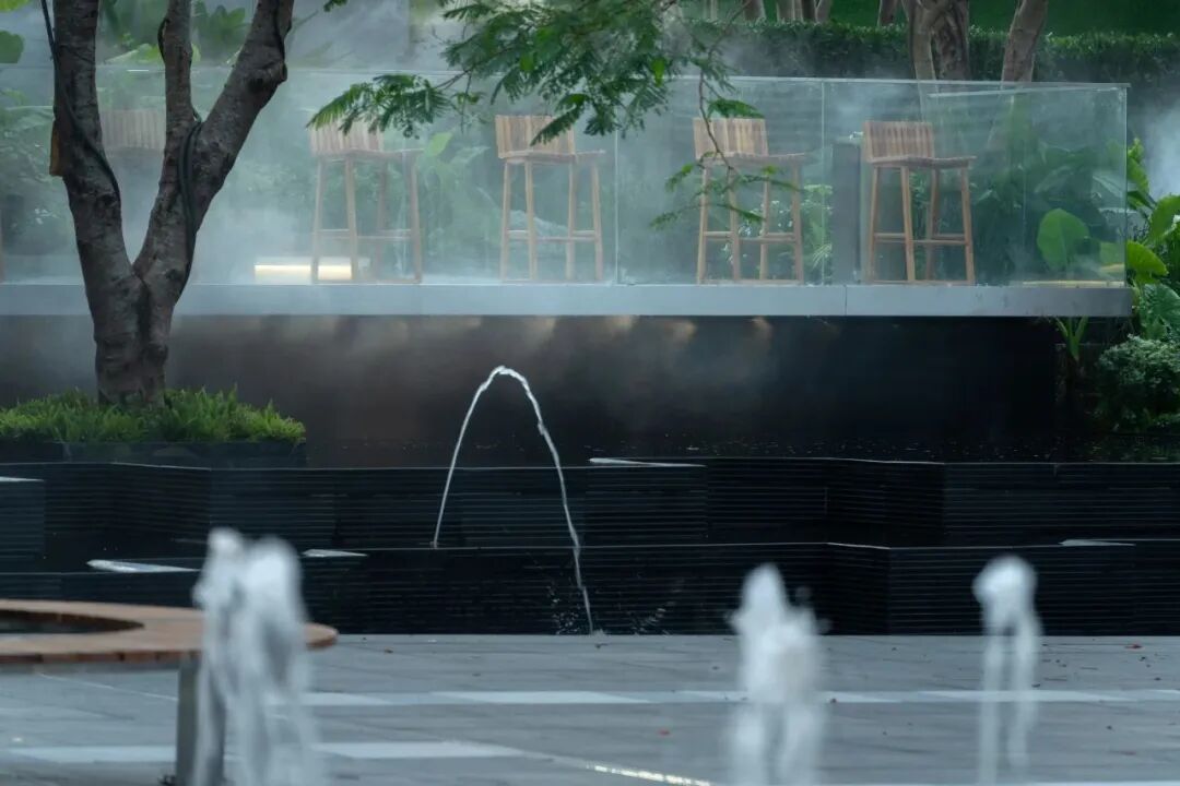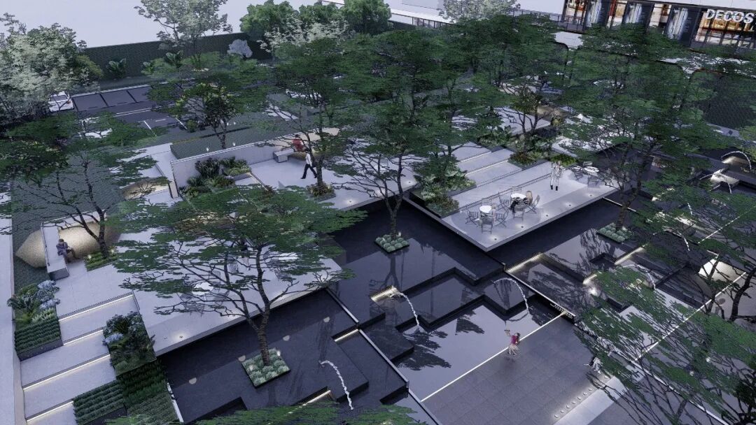 林下广场与漂浮花园的高差通过精致叠水得到巧妙处理,再融入互动跳泉来增加场地趣味性以此来吸引人流。创造了一个舒适的林下休息空间又创造了一个精致的商业集市空间。