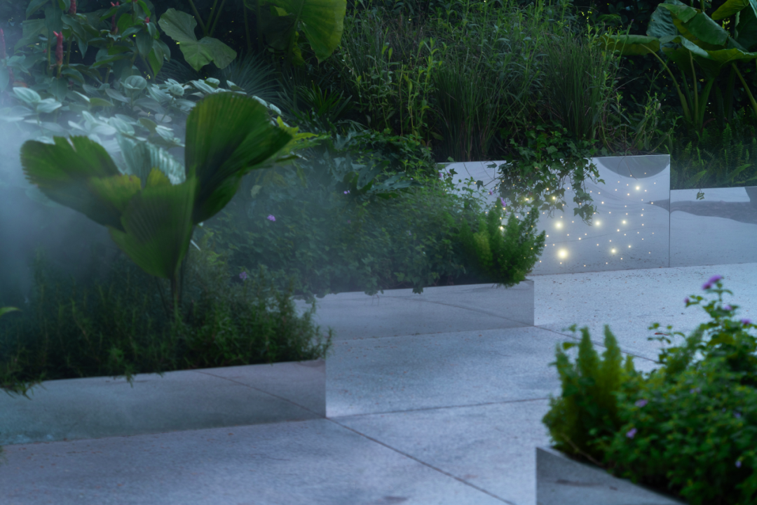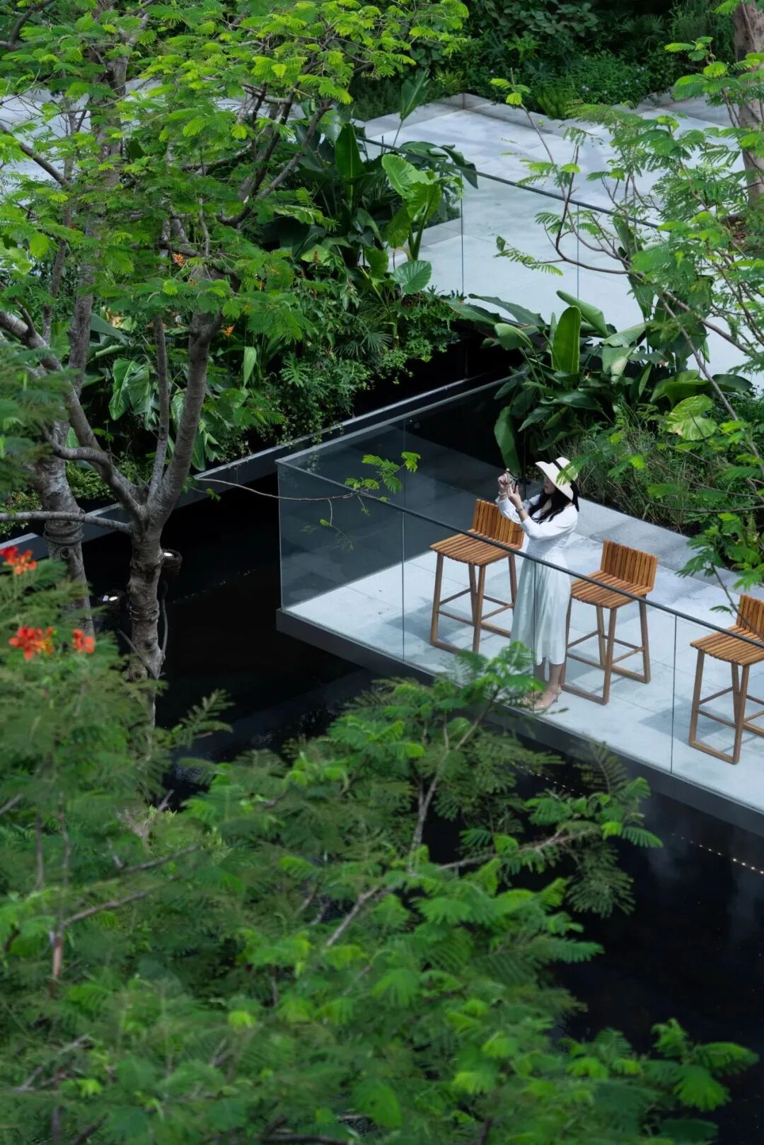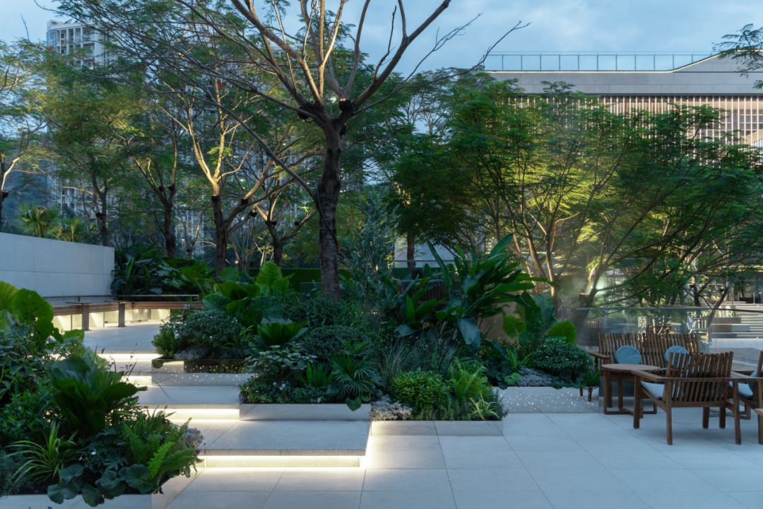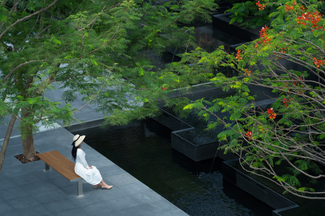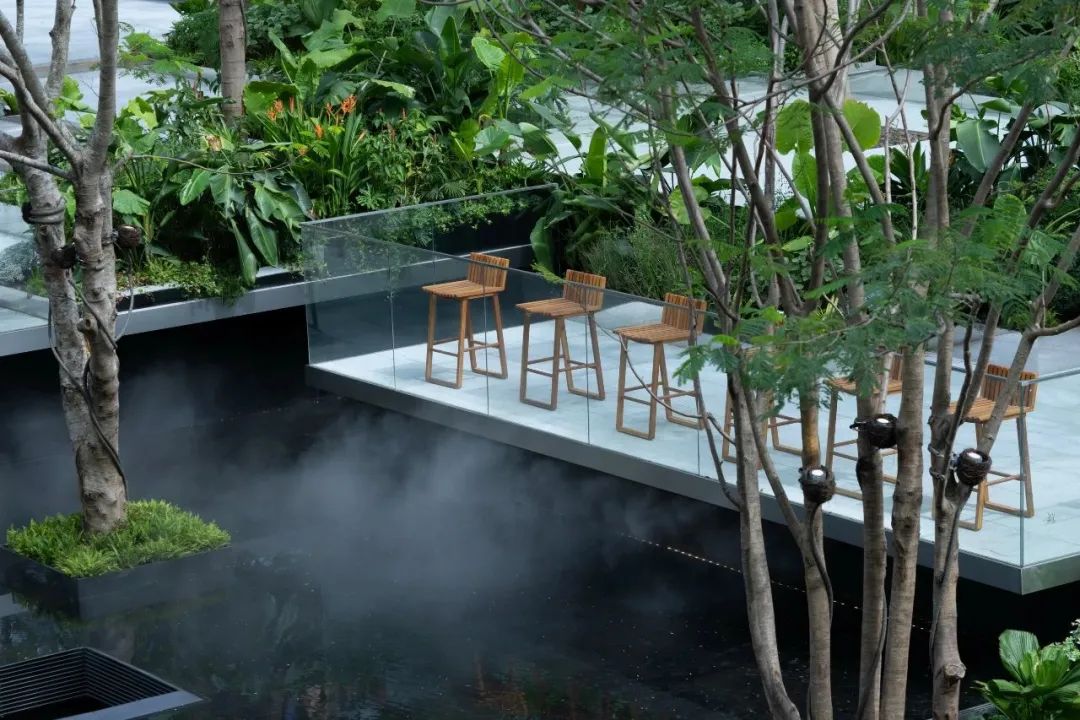 整体广场硬质铺装面积大,加上水景本身就是一大亮点,选择什么样的乔木既不会喧宾夺主又能够贴切“漂浮”的主题是个难题。几轮激烈思维碰撞之下,最后敲定乔木用凤凰木的原因在于其本身枝叶轻盈的特质和盛花期给人带来的明艳动人。地被则用混合式种植手法将自然能量带回并融于喧嚣都市,营造宁静纯朴、浪漫丰盛的自然之美。龟甲冬青球,珍珠狗牙花等球类做基底骨架重复出现在整个场景当中,运用海芋、鹤望兰、圆叶轴榈等自身姿态轻盈的质感植物呼应漂浮花园主题,再搭配各种富有生命力的热带植物,营造放松环境;大叶、线性、条状叶植物穿梭于整个区域营造雨林度假氛围。