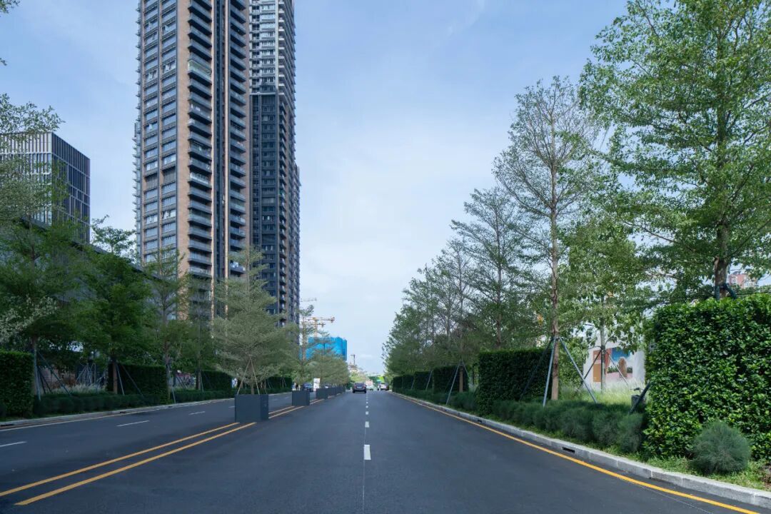 道路两边乔木用小叶榄仁和火焰木,灌木种植火山榕绿篱,地被种植木麻黄球和柳叶马鞭草,道路中间用花箱种植锦叶榄仁,营造尊奢的礼序感提升林荫归家路的体验。