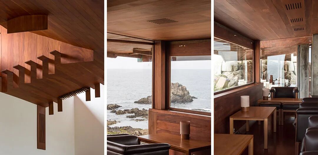 茶室处也是一面巨大的玻璃窗,将景观最大程度展现,低矮的屋檐将人们的视线引向窗外,完整而巨大的开窗将海滩的景色框景成为一副生动的画面。