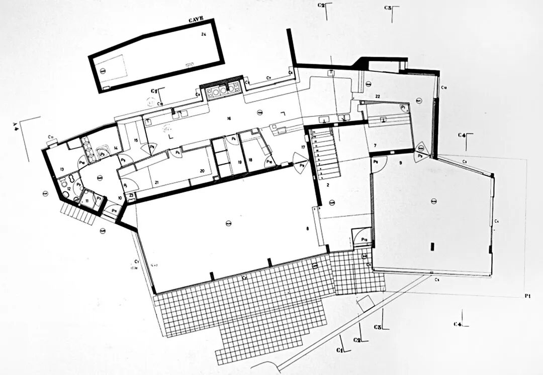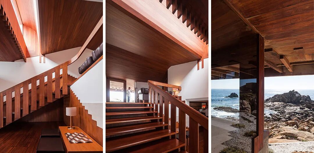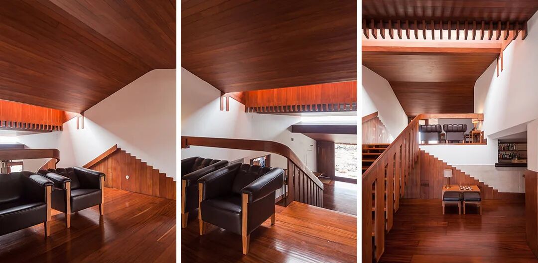 在这个项目中,西扎试图让柱子保留一个不反光的颜色,独立在木头与白墙的主要系统之外,并且一定程度上融入南面的岩石之中,借此来减少柱子的存在对于空间的影响。
