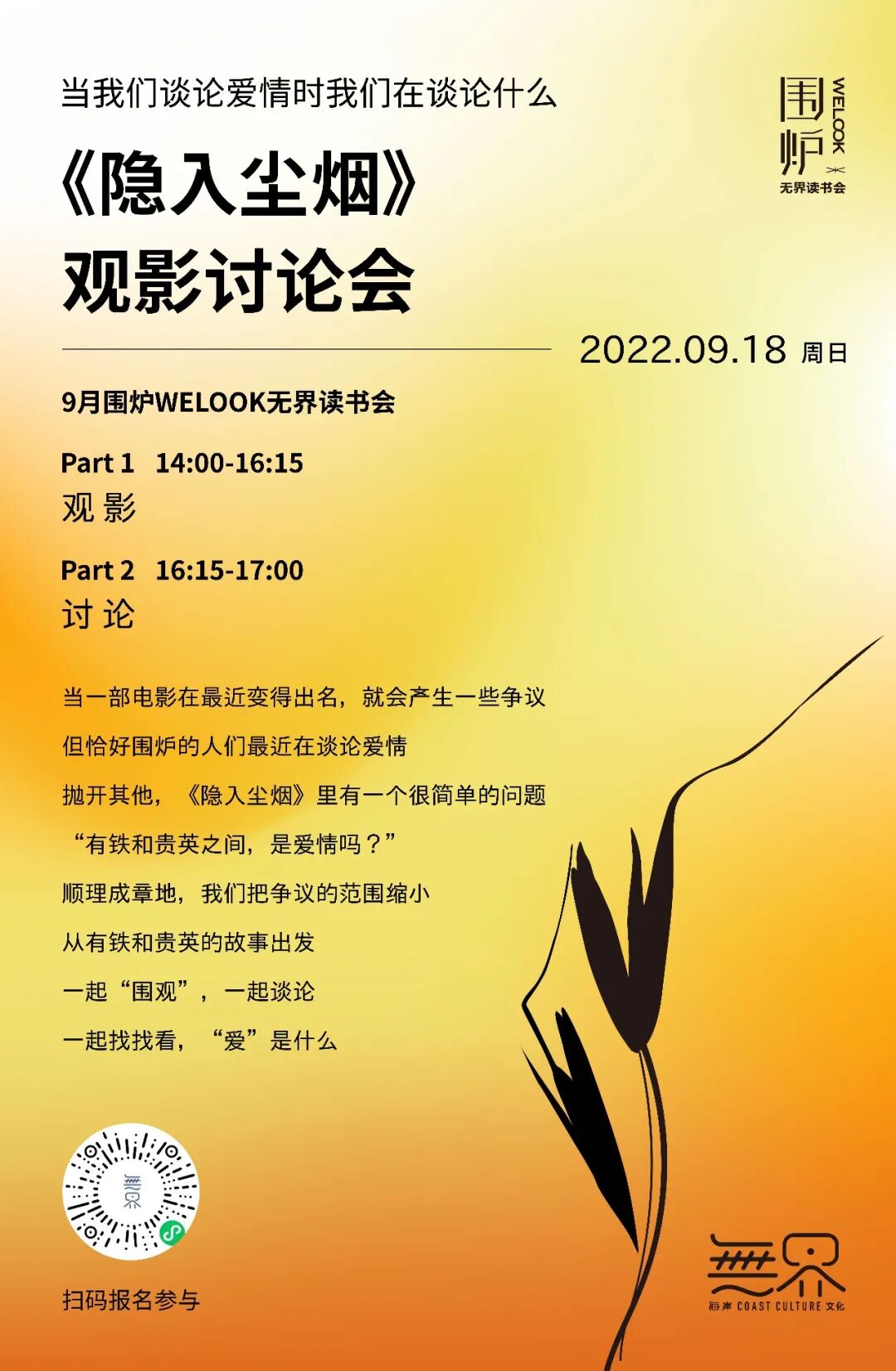 9月“围炉WELOOK无界读书会”,我们将邀请各位一起走进《隐入尘烟》,一起来看看有铁和贵英之间的故事。观影后,我们从有铁和贵英的故事出发,一起谈论“有铁和贵英之间,是爱情吗?” ,一起追问“爱”是什么。
