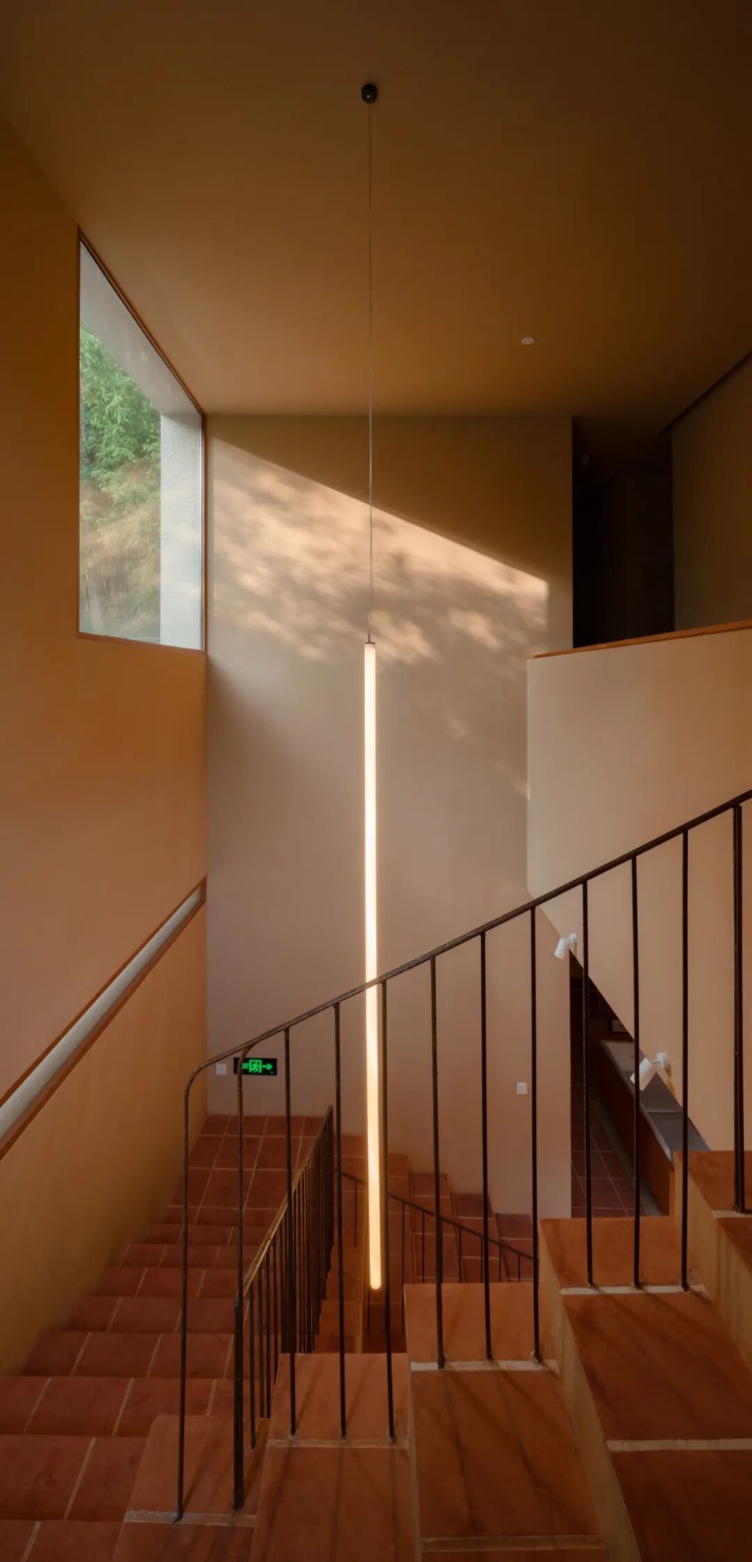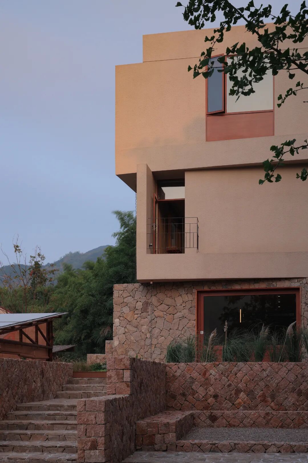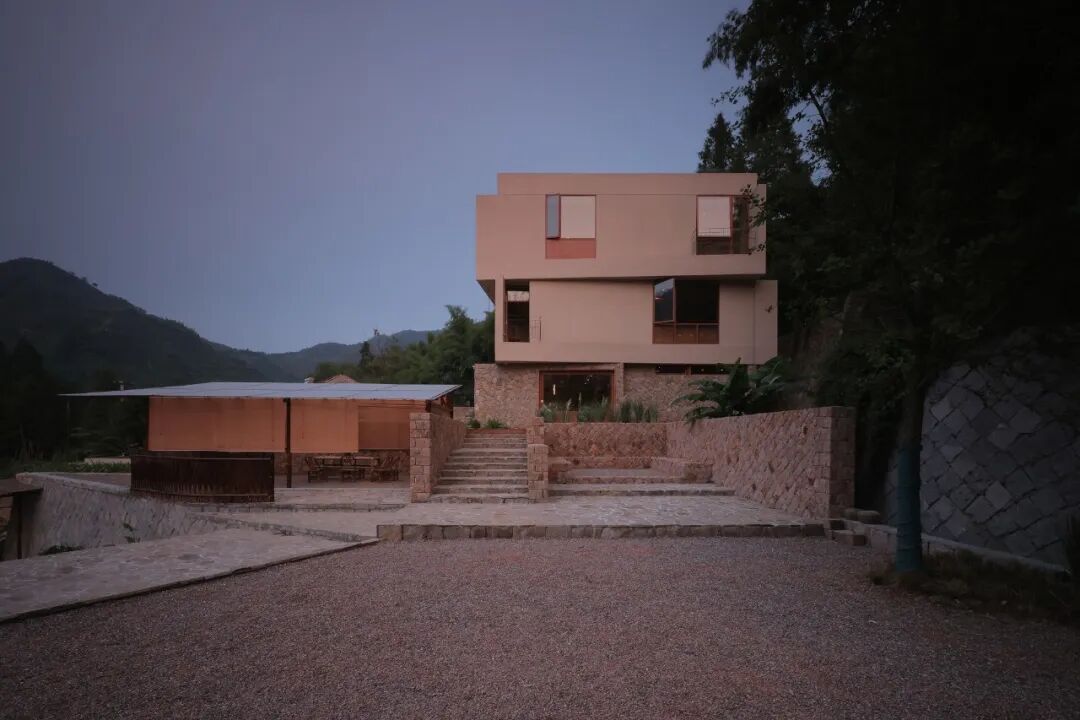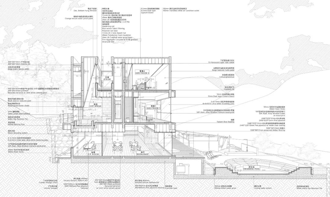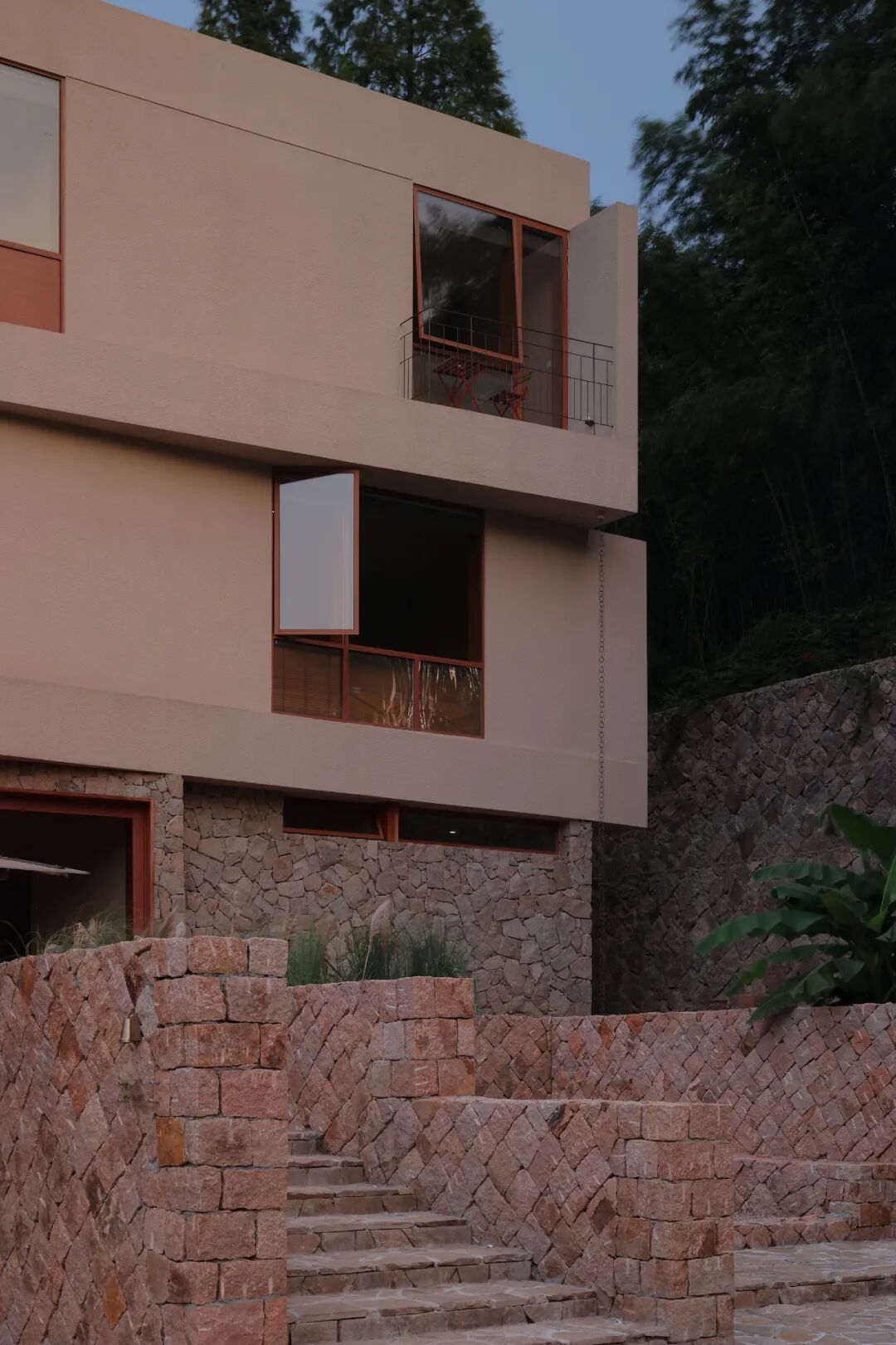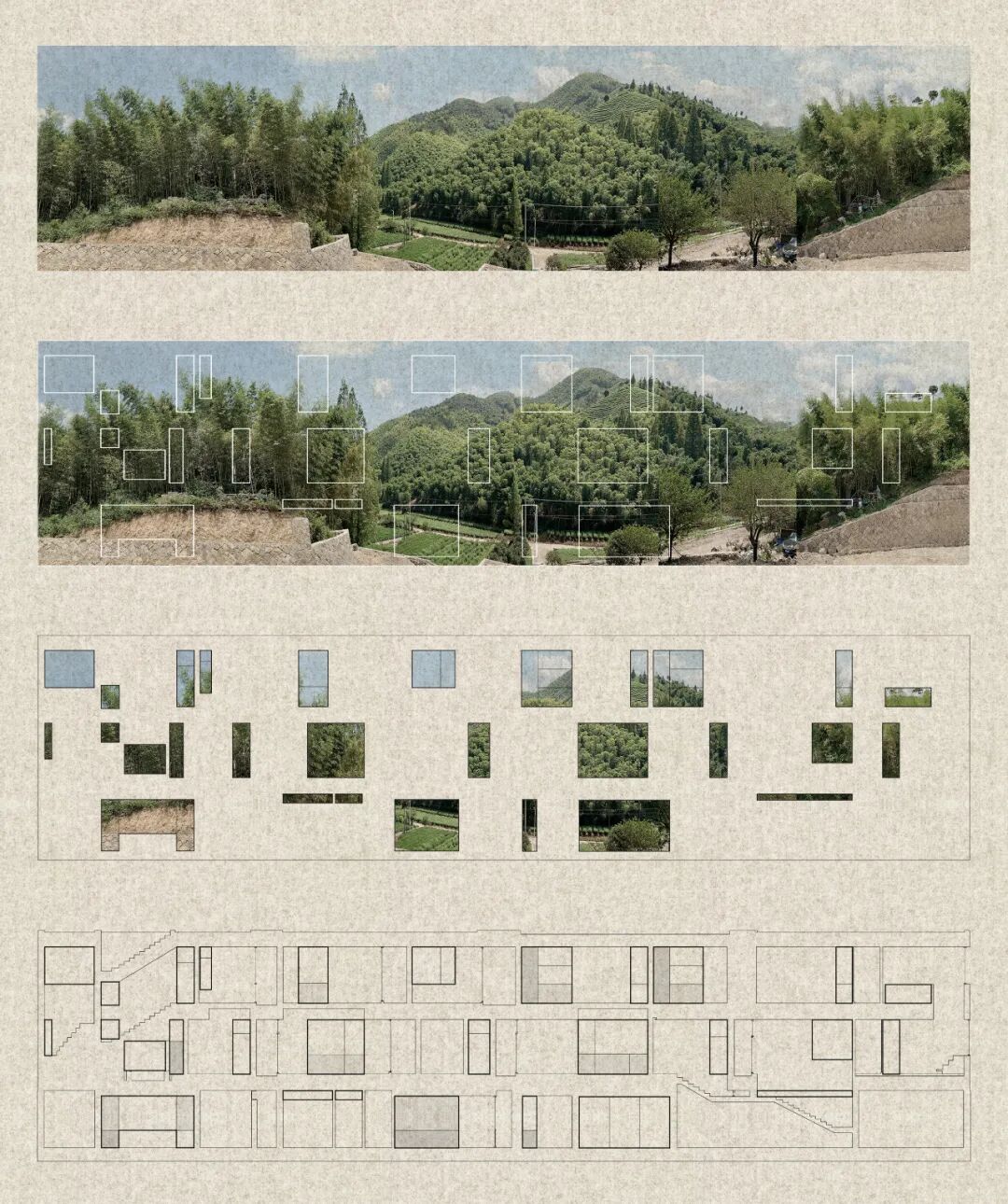 设计解读 场地初探 项目基地位于浙江省湖州市德清县莫干山镇甘露茶厂的西侧,该茶厂由业主兄弟二人经营,业主希望通过改建自家老宅后拉动当地采茶产业。原始老宅基地北面背靠竹海,东面面朝茶田,前方是开阔的山峦。当我们第一次到访时业主已将老宅完全拆除,并平整了场地。 ©️实在建筑SZ-ARCHITECTS 建造条件 同时由于当地政策限制,新建建筑长宽高均不得超过12m,因此建造条件限制较为苛刻,建筑以立方体的姿态被孤立在一块空地中。业主有几方面的诉求,1.希望将造价控制在非常低的范围内。2.民宿建成之后他和家人们也将其作为自己的新家,在此建筑中居住和生活。3.莫干山作为莫干黄芽的重要产地,重新激活茶产业,他希望民宿建成后也是一个黄芽体验馆,可以招待村里的客人,定期举办品茶、赏茶、论茶的活动。因此该项目既是一栋对外运营的民宿,同时也是一个温馨的“家”,更是周边村民的“客厅”。 ©️实在建筑SZ-ARCHITECTS 设计切入点 项目场地的四周虽然拥有丰富多样的景色和植物,水杉、茶田、竹林和远处的山峦,但是较为杂乱无序。 因此我们试图将视觉所见的景色进行重新梳理,结合建筑内部的路径动线设计,依次从高到低,随着建筑各个立面不同的开窗方式,从多个角度、高度引入形成了视觉对景,不同的空间尺度和类型进行呼应。 对应山峰、山谷、山脚、山麓、山腰有节奏的将每个景色排列到每个窗景上,如同一幅展开的山水长卷。 ©️实在建筑SZ-ARCHITECTS 为了消解原本由于建造条件限制而形成的较为呆板的正方体,我们将原本悬挑的阳台进行斜向延伸,形成了在视觉上每层建筑朝向各有不同的效果,使得建筑的体态更为丰富,同时也保证了土建的施工难度和整体造价控制。建筑门窗对应不同景色和不同房间设置了多种不同的开启方式,通过在窗套上增设可折叠上翻的活动挑板,当挑板翻起时可作为房间的吧台使用,丰富了窗户的功能性。 建筑内部的布局为了将民宿和家有机地融合在一起,我们将房屋的一层设置为家和民宿的共同起居空间,包厢通过移动隔断形成可封闭餐厅,既能作为民宿的商务包厢使用,也是家的餐厅。大堂的客厅提供了家人与客人在民宿中互相交流的空间。整体建筑通过设置三处挑空空间,串联起不同楼层视觉上的对景体验。为了确保阳光可以准确地射入室内,我们根据1:15的实体手工模型,调整了窗洞大小以及吊顶的斜度。三楼的户外中庭将自然与天光引入室内,模糊了室内外的边界。 土法建造 乡村建造的难点在于施工队并非城市中有经验的专业施工建设团队,基本为村中的家族团队,并且衍生出了许多城市中不常见的土法建造。 在建筑主体混凝土结构浇筑时,我们非常惊喜地看到了当地用莫干山最常见的竹子来代替原本混凝土浇筑时采用的支撑钢管架。通过大量的毛竹进行支撑混凝土楼板,形成了一个非常有趣野生的支撑系统,正如莫干山的竹林那样充满生命力。 ©️大川又Mata Okawa ©️大川又Mata Okawa 建筑材料 我们希望建筑材料能具有在地性,回到自然与营造的关系上,同时满足现代生活的实际要求。我们充分地利用当地现有的材料,既控制建造成本又能找到当地工匠施工。垒毛石墙、竹结构茶棚、真石漆、室内的红色黏土砖等都是当地常见的材料。 莫干山横岭村传统民居大部分分为两种,一种是砖墙作为建筑墙体,外墙以水泥抹灰作为装饰。另一种则是以石墙作为建筑结构墙体的石构建筑。 ©️大川又Mata Okawa ©️大川又Mata Okawa 石构建筑是乡村风貌的重要特征,同时也是乡村肌理最重要的痕迹。传统石构建筑虽然有着墙体厚重、保温性能好等优势,但材料损耗极其严重,防水性能较差,抗震效果不佳。完全复刻传统垒石墙的做法并不是最佳选择。 建筑东立面 建筑南立面 因此我们通过保留毛石墙面的视觉效果,同时作为建筑的围护结构,去除传统建筑中毛石墙作为结构支撑的作用,通过在砌块墙与毛石片之间增设保温、防水层,既延续了传统建筑的视觉肌理,也降低了施工难度,提高了建筑材料的热工性能。 ©️大川又Mata Okawa 建筑门窗对应不同景色和不同房间设置了多种不同的开启方式,通过在窗套上增设可折叠上翻的活动挑板,当挑板翻起时可作为房间的吧台使用,丰富了窗户的功能性。 ©️大川又Mata Okawa ©️大川又Mata Okawa ©️大川又Mata Okawa ©️大川又Mata Okawa ©️大川又Mata Okawa ©️大川又Mata Okawa ©️大川又Mata Okawa ©️大川又Mata Okawa ©️大川又Mata Okawa ©️大川又Mata Okawa ©️大川又Mata Okawa ©️大川又Mata Okawa ©️大川又Mata Okawa ©️大川又Mata Okawa ©️大川又Mata Okawa ©️大川又Mata Okawa ©️大川又Mata Okawa ©️大川又Mata Okawa ©️大川又Mata Okawa ©️实在建筑 SZ-ARCHITECTS ©️大川又Mata Okawa ©️大川又Mata Okawa ©️大川又Mata Okawa ©️大川又Mata Okawa ©️大川又Mata Okawa ©️大川又Mata Okawa ©️大川又Mata Okawa ©️大川又Mata Okawa ©️大川又Mata Okawa ©️大川又Mata Okawa ©️大川又Mata Okawa ©️大川又Mata Okawa ©️大川又Mata Okawa ©️大川又Mata Okawa ©️大川又Mata Okawa ©️大川又Mata Okawa ©️大川又Mata Okawa ©️实在建筑 SZ-ARCHITECTS ©️实在建筑 SZ-ARCHITECTS ©️实在建筑 SZ-ARCHITECTS ©️实在建筑 SZ-ARCHITECTS ©️实在建筑 SZ-ARCHITECTS ©️实在建筑 SZ-ARCHITECTS 项目信息 项目名称:莫干山木子林夕云民宿 项目位