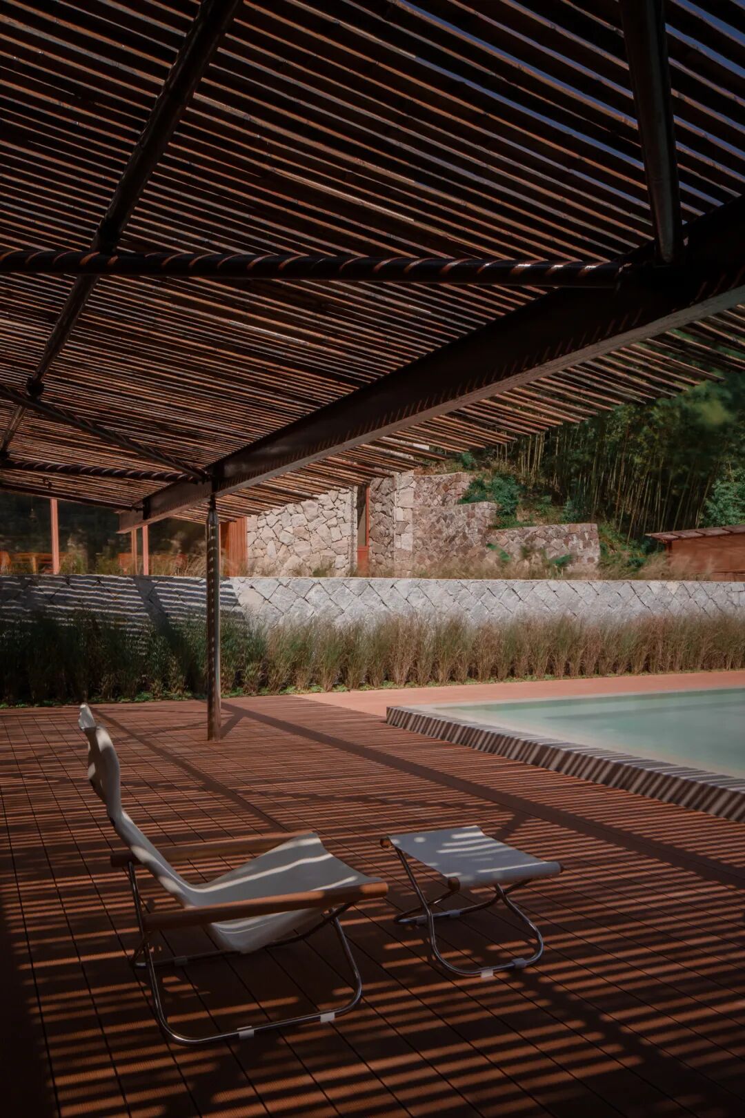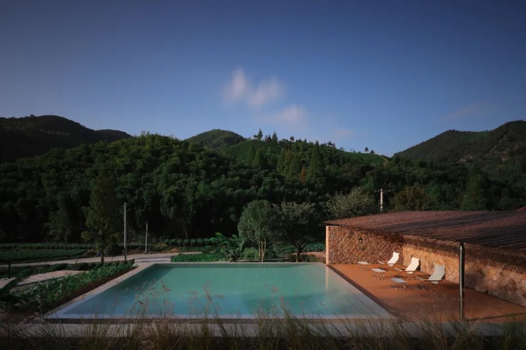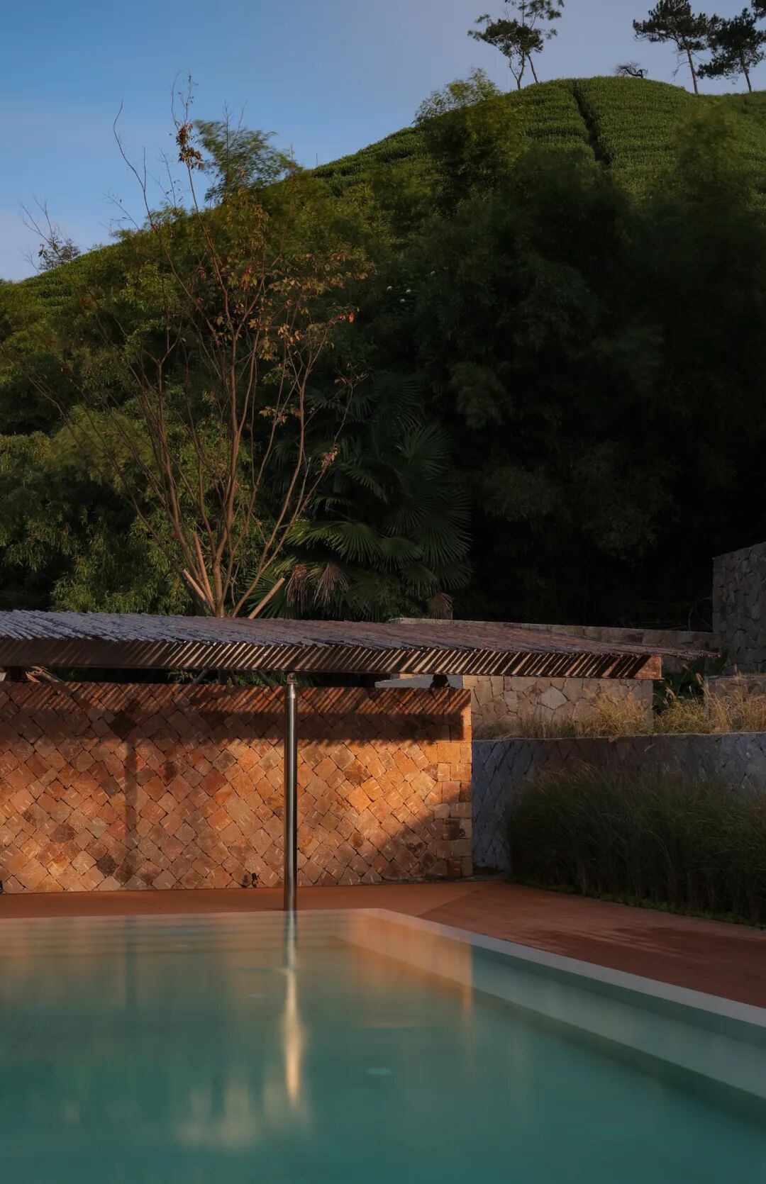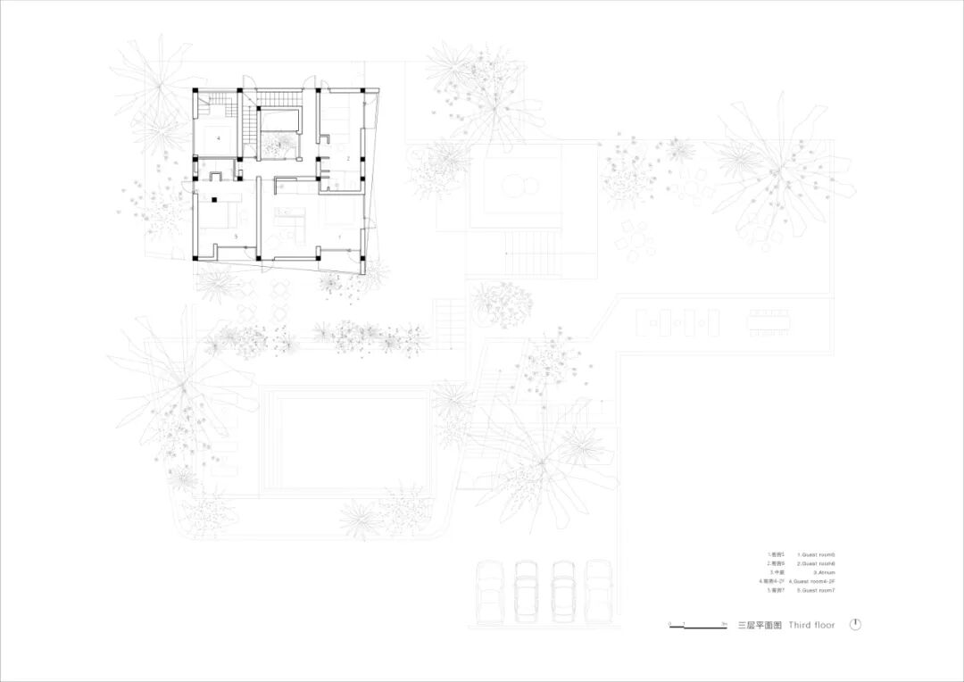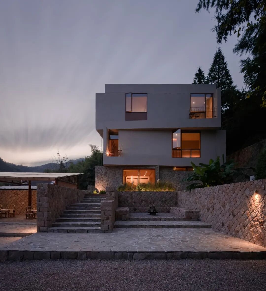 设计解读 场地初探 项目基地位于浙江省湖州市德清县莫干山镇甘露茶厂的西侧,该茶厂由业主兄弟二人经营,业主希望通过改建自家老宅后拉动当地采茶产业。原始老宅基地北面背靠竹海,东面面朝茶田,前方是开阔的山峦。当我们第一次到访时业主已将老宅完全拆除,并平整了场地。 ©️实在建筑SZ-ARCHITECTS 建造条件 同时由于当地政策限制,新建建筑长宽高均不得超过12m,因此建造条件限制较为苛刻,建筑以立方体的姿态被孤立在一块空地中。业主有几方面的诉求,1.希望将造价控制在非常低的范围内。2.民宿建成之后他和家人们也将其作为自己的新家,在此建筑中居住和生活。3.莫干山作为莫干黄芽的重要产地,重新激活茶产业,他希望民宿建成后也是一个黄芽体验馆,可以招待村里的客人,定期举办品茶、赏茶、论茶的活动。因此该项目既是一栋对外运营的民宿,同时也是一个温馨的“家”,更是周边村民的“客厅”。 ©️实在建筑SZ-ARCHITECTS 设计切入点 项目场地的四周虽然拥有丰富多样的景色和植物,水杉、茶田、竹林和远处的山峦,但是较为杂乱无序。 因此我们试图将视觉所见的景色进行重新梳理,结合建筑内部的路径动线设计,依次从高到低,随着建筑各个立面不同的开窗方式,从多个角度、高度引入形成了视觉对景,不同的空间尺度和类型进行呼应。 对应山峰、山谷、山脚、山麓、山腰有节奏的将每个景色排列到每个窗景上,如同一幅展开的山水长卷。 ©️实在建筑SZ-ARCHITECTS 为了消解原本由于建造条件限制而形成的较为呆板的正方体,我们将原本悬挑的阳台进行斜向延伸,形成了在视觉上每层建筑朝向各有不同的效果,使得建筑的体态更为丰富,同时也保证了土建的施工难度和整体造价控制。建筑门窗对应不同景色和不同房间设置了多种不同的开启方式,通过在窗套上增设可折叠上翻的活动挑板,当挑板翻起时可作为房间的吧台使用,丰富了窗户的功能性。 建筑内部的布局为了将民宿和家有机地融合在一起,我们将房屋的一层设置为家和民宿的共同起居空间,包厢通过移动隔断形成可封闭餐厅,既能作为民宿的商务包厢使用,也是家的餐厅。大堂的客厅提供了家人与客人在民宿中互相交流的空间。整体建筑通过设置三处挑空空间,串联起不同楼层视觉上的对景体验。为了确保阳光可以准确地射入室内,我们根据1:15的实体手工模型,调整了窗洞大小以及吊顶的斜度。三楼的户外中庭将自然与天光引入室内,模糊了室内外的边界。 土法建造 乡村建造的难点在于施工队并非城市中有经验的专业施工建设团队,基本为村中的家族团队,并且衍生出了许多城市中不常见的土法建造。 在建筑主体混凝土结构浇筑时,我们非常惊喜地看到了当地用莫干山最常见的竹子来代替原本混凝土浇筑时采用的支撑钢管架。通过大量的毛竹进行支撑混凝土楼板,形成了一个非常有趣野生的支撑系统,正如莫干山的竹林那样充满生命力。 ©️大川又Mata Okawa ©️大川又Mata Okawa 建筑材料 我们希望建筑材料能具有在地性,回到自然与营造的关系上,同时满足现代生活的实际要求。我们充分地利用当地现有的材料,既控制建造成本又能找到当地工匠施工。垒毛石墙、竹结构茶棚、真石漆、室内的红色黏土砖等都是当地常见的材料。 莫干山横岭村传统民居大部分分为两种,一种是砖墙作为建筑墙体,外墙以水泥抹灰作为装饰。另一种则是以石墙作为建筑结构墙体的石构建筑。 ©️大川又Mata Okawa ©️大川又Mata Okawa 石构建筑是乡村风貌的重要特征,同时也是乡村肌理最重要的痕迹。传统石构建筑虽然有着墙体厚重、保温性能好等优势,但材料损耗极其严重,防水性能较差,抗震效果不佳。完全复刻传统垒石墙的做法并不是最佳选择。 建筑东立面 建筑南立面 因此我们通过保留毛石墙面的视觉效果,同时作为建筑的围护结构,去除传统建筑中毛石墙作为结构支撑的作用,通过在砌块墙与毛石片之间增设保温、防水层,既延续了传统建筑的视觉肌理,也降低了施工难度,提高了建筑材料的热工性能。 ©️大川又Mata Okawa 建筑门窗对应不同景色和不同房间设置了多种不同的开启方式,通过在窗套上增设可折叠上翻的活动挑板,当挑板翻起时可作为房间的吧台使用,丰富了窗户的功能性。 ©️大川又Mata Okawa ©️大川又Mata Okawa ©️大川又Mata Okawa ©️大川又Mata Okawa ©️大川又Mata Okawa ©️大川又Mata Okawa ©️大川又Mata Okawa ©️大川又Mata Okawa ©️大川又Mata Okawa ©️大川又Mata Okawa ©️大川又Mata Okawa ©️大川又Mata Okawa ©️大川又Mata Okawa ©️大川又Mata Okawa ©️大川又Mata Okawa ©️大川又Mata Okawa ©️大川又Mata Okawa ©️大川又Mata Okawa ©️大川又Mata Okawa ©️实在建筑 SZ-ARCHITECTS ©️大川又Mata Okawa ©️大川又Mata Okawa ©️大川又Mata Okawa ©️大川又Mata Okawa ©️大川又Mata Okawa ©️大川又Mata Okawa ©️大川又Mata Okawa ©️大川又Mata Okawa ©️大川又Mata Okawa ©️大川又Mata Okawa ©️大川又Mata Okawa ©️大川又Mata Okawa ©️大川又Mata Okawa ©️大川又Mata Okawa ©️大川又Mata Okawa ©️大川又Mata Okawa ©️大川又Mata Okawa ©️实在建筑 SZ-ARCHITECTS ©️实在建筑 SZ-ARCHITECTS ©️实在建筑 SZ-ARCHITECTS ©️实在建筑 SZ-ARCHITECTS ©️实在建筑 SZ-ARCHITECTS ©️实在建筑 SZ-ARCHITECTS 项目信息 项目名称:莫干山木子林夕云民宿 项目位