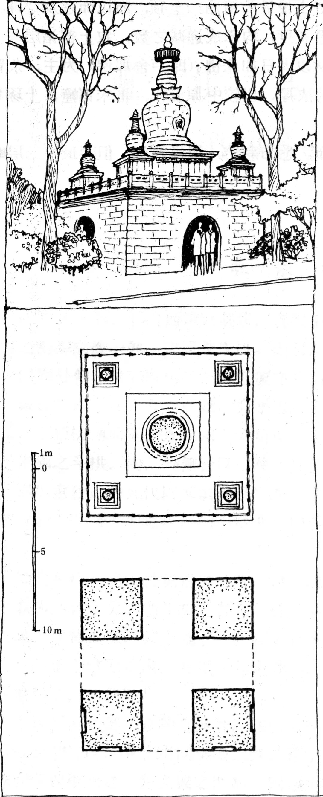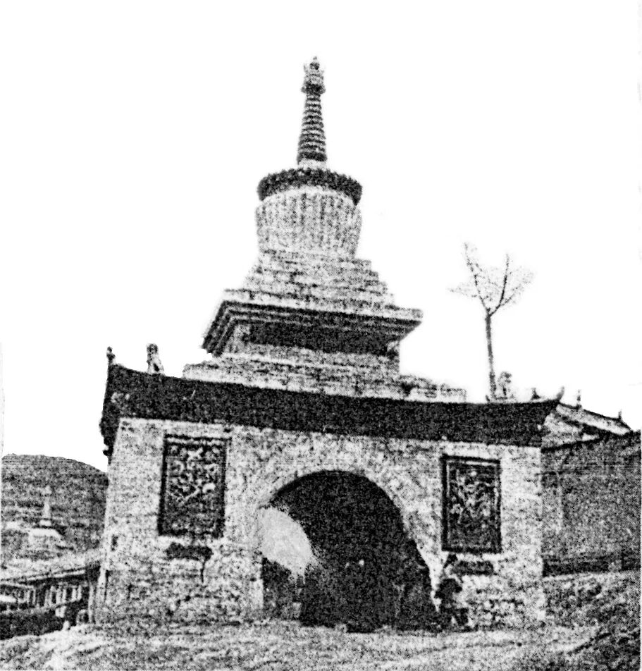 塔尔寺位于青海省湟中县鲁沙尔镇,原为藏传佛教格鲁派创始人宗喀巴的诞生地,最初建一纪念小塔,后来发展为一座庞大的寺院,为藏传佛教格鲁派(黄教)六大丛林之一,发展为格鲁派在甘肃青海一带最大的经学院,全盛时有三千僧众。宗喀巴的母亲在宗喀巴诞生地建塔在洪武年间,发展为寺院在嘉靖年间,明清历代维修增建,始成现在的规模。四门塔又称过门塔,位于塔尔寺北侧过去入口处,方形墩台内贯十字穹窿甬道,开四个拱门,台座边长6.6米,高4.4米。台上正中建一覆钵式喇嘛塔,通高13.4米。台座檐口设砖雕斗栱和椽子,上覆琉璃瓦,塔身瓶肚以上又加一圈琉璃檐口,整个造形虽然还保持着觉顿式喇嘛塔的特点,但又具有鲜明的地方特色。此塔为乾隆十三年(1748)由第二十六任法台赛多诺门汗·阿旺丹贝坚赞主持建造。阿旺丹贝坚赞当年主持加固了大金瓦殿的大银塔,乾隆皇帝御赐“梵教法幢”金字大匾挂在大金瓦殿内。四门塔今尚存,但已改为二门,近年维修一新。塔尔寺主持阿嘉·洛桑图旦活佛托人赠我《青海塔尔寺修缮工程报告》一书,隆谊可感,书中有四门塔的照片和实测图。(图17、图18)