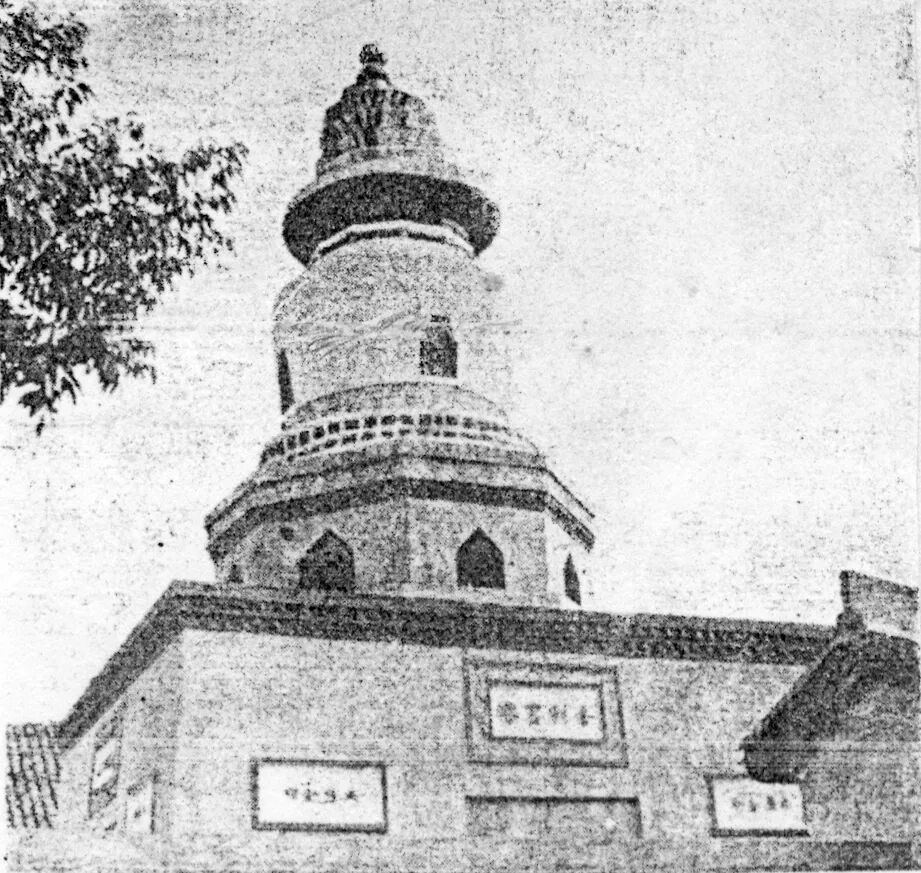 刘敦桢先生《西南古建筑调查概况》称“金刚宝座式塔输入云南,似亦始于元代。第元建之昆明万庆寺白塔毁于民国初季。今之所存唯昆明妙湛寺明天顺间所建石塔一处而已。此外夏世南《元代云南史地丛考》谓昆明小东门外穿心鼓楼,亦属此式,但台上楼观,年代甚新,原有之塔作何式样,已无术穷究,只有存而不论。”万庆寺过街塔原在昆明城东,毁于1911年。这座过街塔有一张法国人方苏雅1896年拍摄的老照片今尚存,载见《中国文化遗产》2007年第3期李燕、庞博《百年老照片,艰难的回归路》。文中老照片新加说明称“昆明白塔原址上曾建有万庆寺,故名万庆塔,位于云南府城昆明东1公里处,始建于元代。1911年因扩街修路被毁,是当年拓东路上的标志性建筑之一。图右为真武祠。”这座过街塔有点像旧城里的穿心鼓楼,但她不是建在城内,而是建在昆明城东门外的大道上,是名副其实的过街塔。塔下是一个方形台座,下面开有券洞,上面建一座覆钵式喇嘛塔,塔是砖砌的,外面抹着白灰。这座塔早已不存,老照片给我们提供了一个难得的记忆形象,十分珍贵。台座上只在正中建有一座塔,四角没有小塔,不是金刚宝座式塔。(图7)