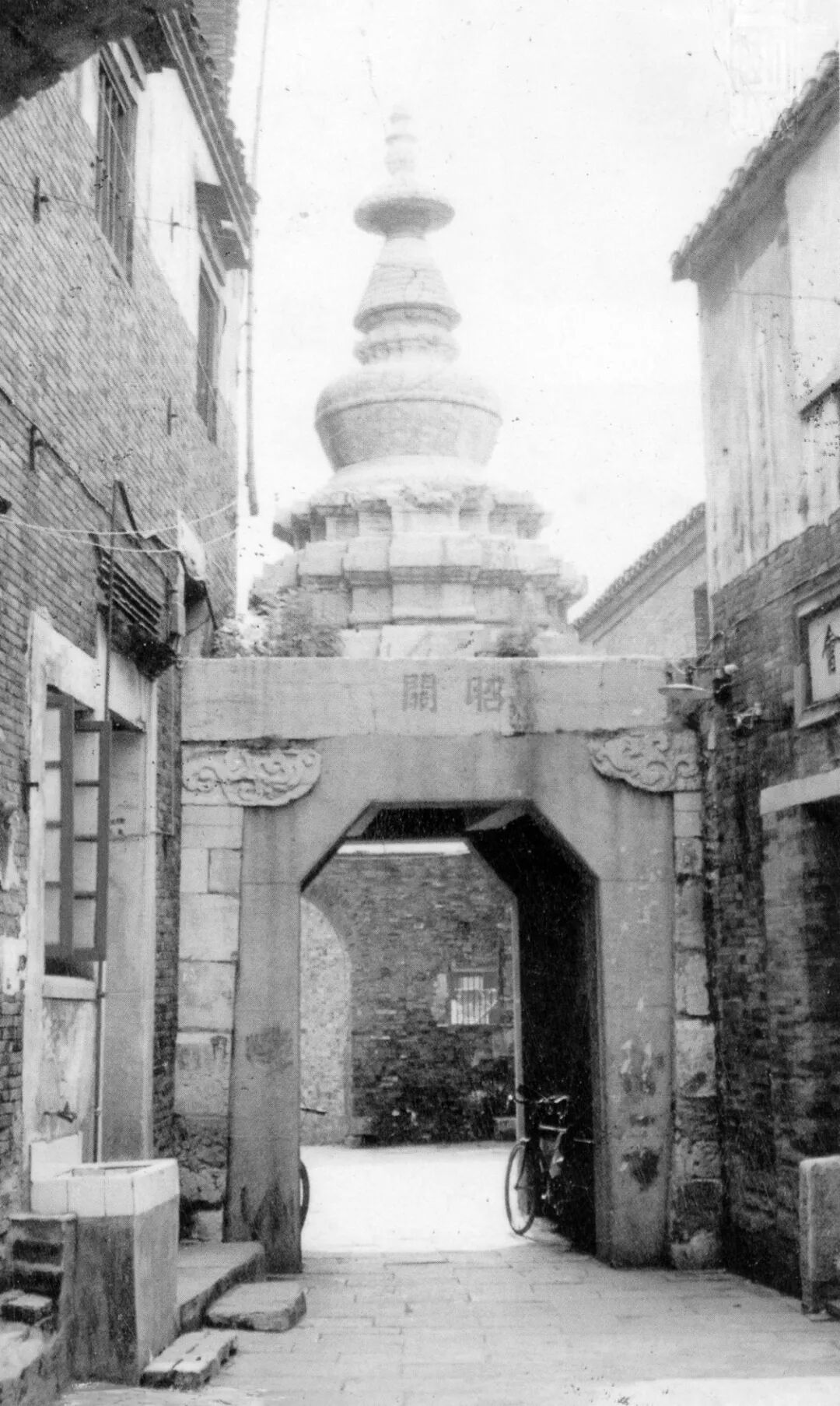 《日下旧闻考》卷一百三引《五城寺院册》:“静宜园之西万安山有法海寺、法华寺。”《臣等谨按》云:“法海、法华二寺前后互相连属,相传为宏教寺遗址。本朝顺治十七年修建,改今名。前为法海寺,门上有小塔,门内为关帝殿,约半里许为法华寺。”光绪三十年常印绘《五园三山外三营地图》,图上所绘法海寺在万安山下,图注称法海寺至元年间建,明正统中修,顺治十七年重修。图中法海寺之前画出有过街塔,法海寺门外之过街塔则为清顺治十七年(1650)所建。1932年林徽音、梁思成合著《平郊建筑杂录》,对法海寺的过街塔有专门报导,并留下照片二帧,极为珍贵。《平郊建筑杂录》记云:“这门的形式是与寻常的极不相同;有圆拱门洞的城楼模样,上面却顶着一座喇嘛式的塔——一个缩小的北海白塔。”“这圆拱门洞是石砌的。东面门额上题着‘敕赐法海禅寺’”,旁边陪着一行“顺治十七年夏月吉日”的小字。西面额上题着三种文字,其中看得懂的中文是“唵巴得摩乌室尼渴华麻列吽□吒”,其他两种或是满蒙各占一个。走路到这门下,疲乏之余,读完了这一行题字,也就觉得轻松许多。“门洞里还有隐约的画壁。”“这座小小带塔的寺门,除门洞上面一围砖栏杆外,完全是石造的。这在中国又是个少有旧例。”这座塔和门洞都已不存,留下来的两幅照片极珍贵。(图15,图16)
