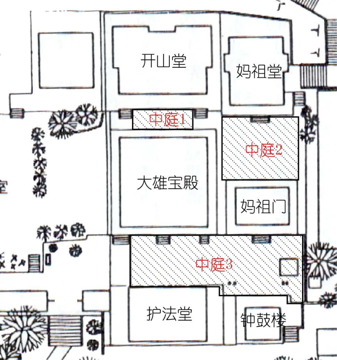 护法堂与钟鼓楼并列,大雄宝殿与妈祖门并列,开山堂、妈祖堂与祠堂并列,形成了方形院落型布局。各建筑之间围合出了三个以石板铺砌的中庭空间,其中最大的中庭位于大雄宝殿与妈祖门之前,由妈祖门、回廊和妈祖堂围合的中庭次之,开山堂前中庭最小(图4)。