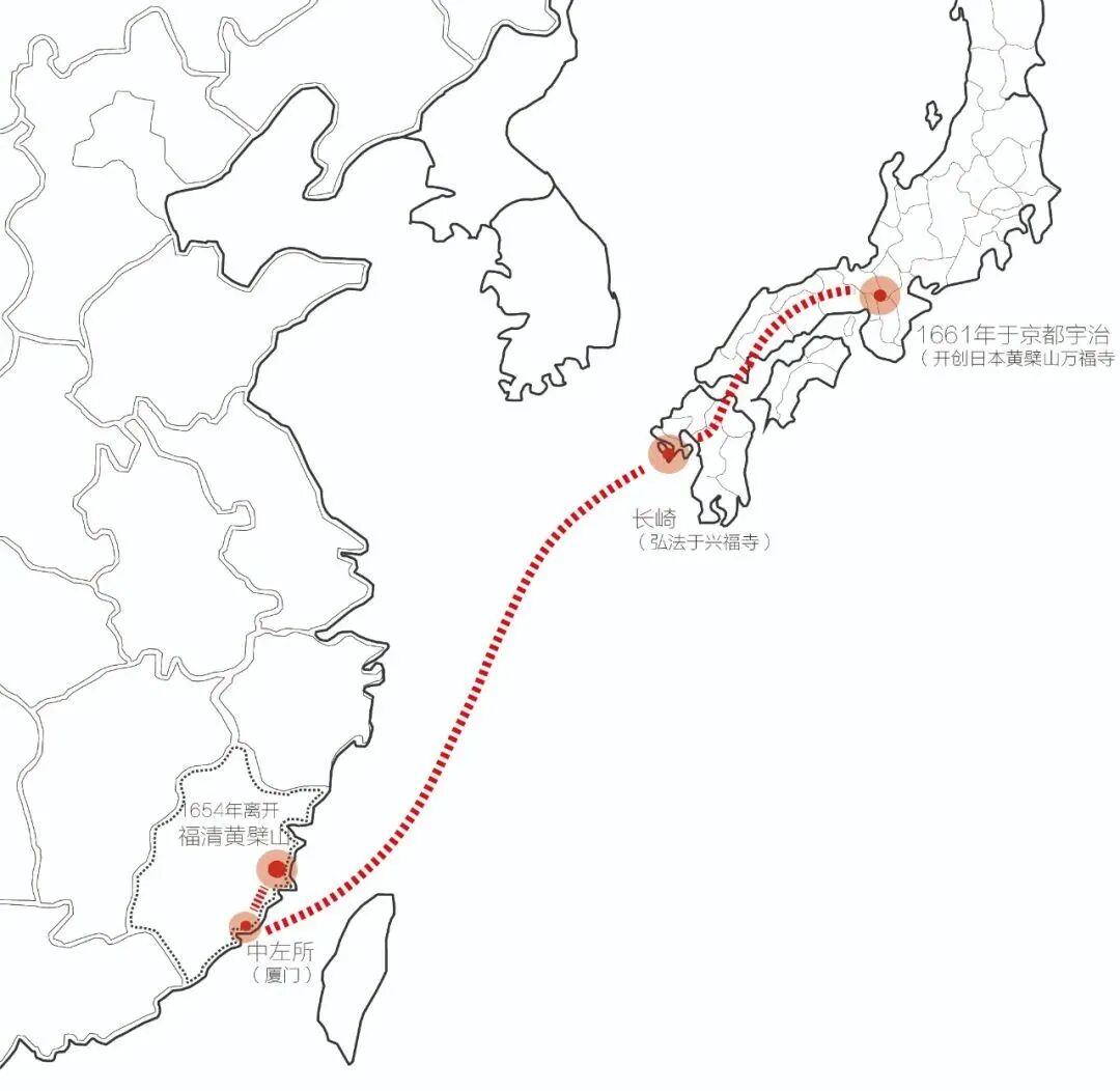 日本江户时代初期,黄檗派首先传入了中国人往来频繁的港口城市日本长崎,从中国东渡的僧人先后在长崎建立了兴福寺、福济寺以及崇福寺,但其传播范围仅限于九州长崎地区,所知者以及信奉者甚少;直至江户中期,即1654年(日本承应3年,即清顺治十一年),福建福清黄檗山万福寺住持隐元隆琦禅师受崇福寺住持之邀经由中左所(厦门)东渡长崎(图1),起初传法于长崎四唐寺之一的兴福寺,在得到德川幕府的支持和赠地以后,于宽文元年(1661年)开创新寺。出于对故乡的思念,隐元禅师仍将新寺命名为黄檗山万福寺(后文称本山京都黄檗山万福寺)。自此隐元禅师在日本开宗立派,将新宗派命名为黄檗宗。黄檗宗在德川幕府以及诸多大名的支持下迅速发展壮大,隐元禅师的弟子、法嗣被日本各地大名邀请开创新寺,并形成了由其弟子领导的十一个流派,随后越来越多的日本寺院归入黄檗宗门下。在黄檗宗建立后的两百余年时间里,黄檗宗文化迅速影响着日本,在日本被称作“黄檗文化”。就佛教本身而言,黄檗宗从禅宗思想、寺院建筑规制、戒律清规、法式仪轨以及寺院制度等方面都给日本佛教界带来了深远影响。除佛教以外,黄檗文化还在语言、书法、音乐、绘画、印刷、医学、制药、雕塑、茶文化、饮食等方面对日本社会产生了广泛的影响。