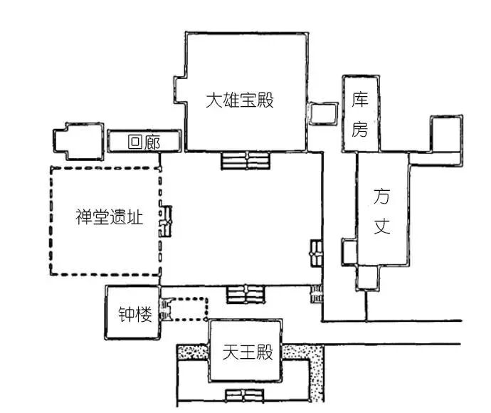 长崎圣福寺,虽然圣福寺与长崎唐三寺并称唐四寺,但圣福寺是在日本本山黄檗寺开创以后的日本延宝5年(1677年)才建立的,可以说是在日本本山黄檗寺的影响下产生的。初创建时期的建筑现仅存天王殿、大雄宝殿、钟楼、三门以及禅堂的遗址,方丈则为后期在库里(包括斋堂)的基础上修建而成。因此初创时期的寺院应该是以天王殿—大雄宝殿为轴线进行布置的,大雄宝殿右为库里(包含斋堂),禅堂遗址位于大雄宝殿左侧与库里相对,钟楼设置在禅堂遗址前、天王殿左;主要殿堂之间没有用回廊相接(图10)。