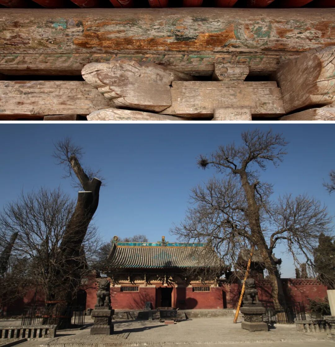 第三通碑记是光绪三十年(1904年)的《补修镇国寺并九间庙碑记》。文中有“虽然经营数载,土木之工虽具,绘画之事未完,本欲次第兴作,告厥成功,无如饥馑薦臻,起派维艰,为之停工者数年。今幸而岁值大有,四外募化亦源源而来,因而续成前功,缺者补之,旧者新之,丹者金碧,东西掩映,焕然改观”等语,可以对应观音殿外檐栱眼壁上的蓝色颜料——最早发明与应用时代为1826年至1827年的人造群青,外檐彩画则借助廉价的新材料重新大大装饰了一番。