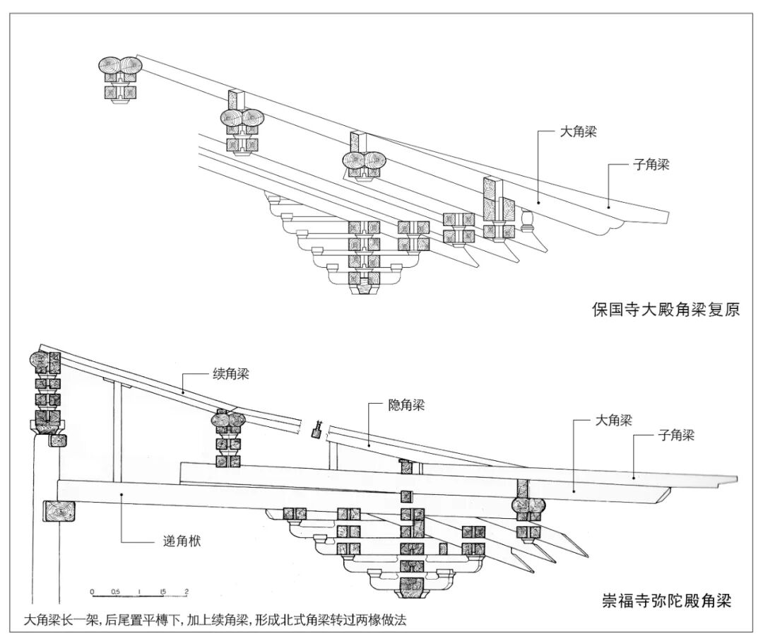 在厦两架与隐角梁并存的情况下,其“角梁转过两椽”并不等同于“角梁斜长两架”,其转过两椽的角梁,是由斜长一架的大角梁与其上的隐角梁和接续的续角梁组合而成的,如金构崇福寺弥陀殿等例(图2)。